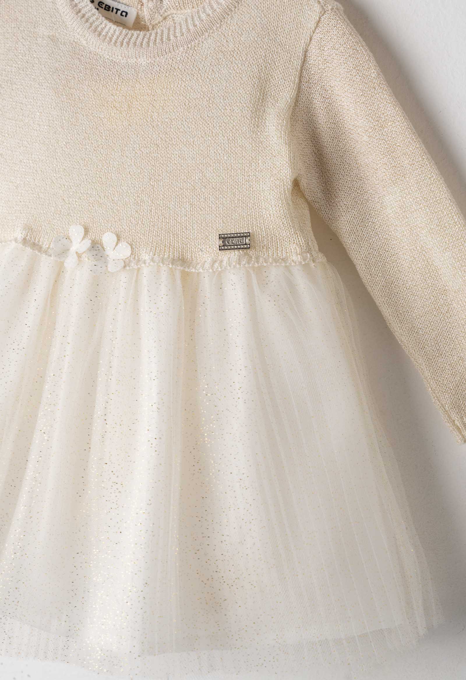 Φόρεμα για κορίτσι 6-24 μηνών. συνδυασμός πλεκτό μπεζ στο επάνω μέρος του φορέματος και τούλι με μπεζ χρώμα με χρυσό στο λα΄τω μέρος του φορέματος