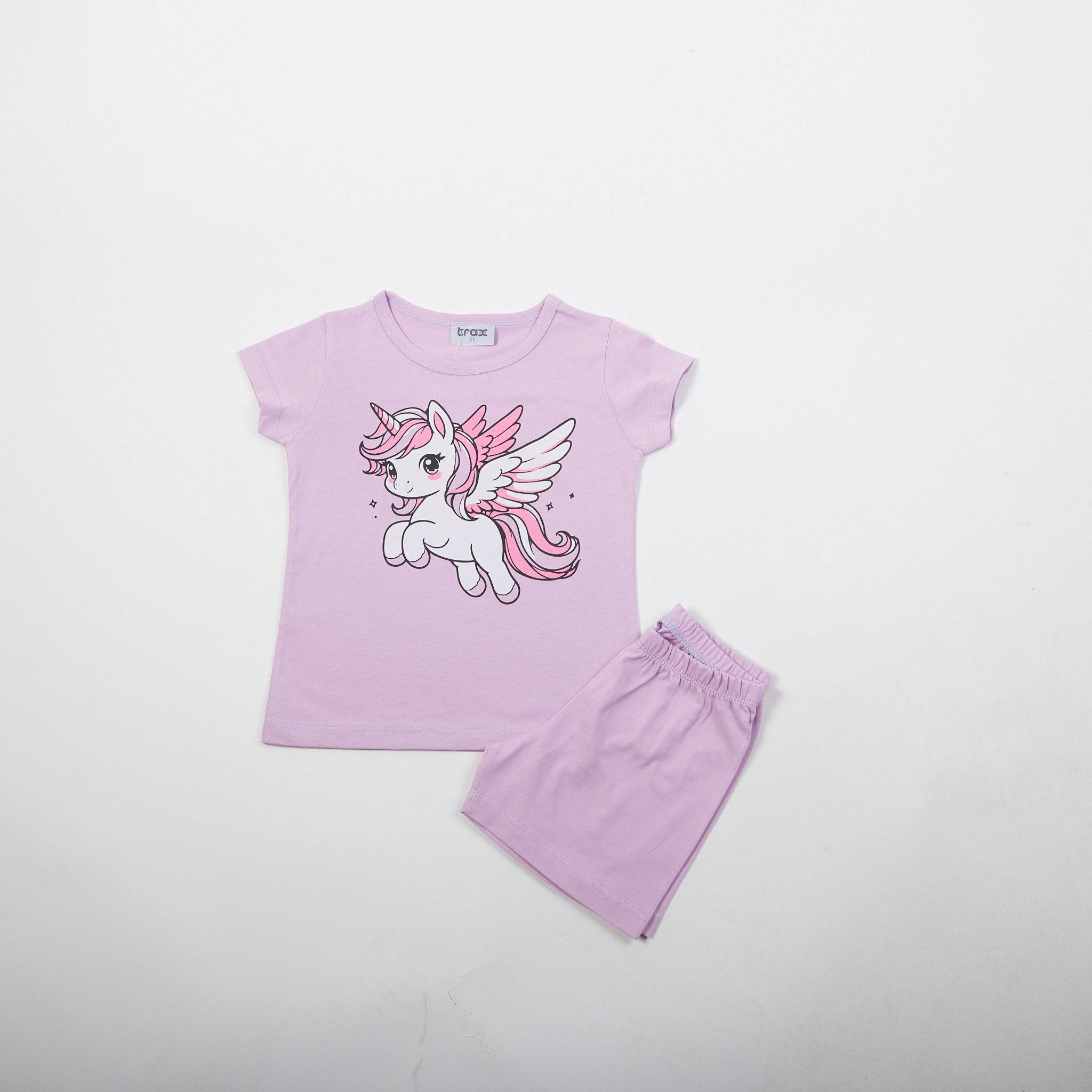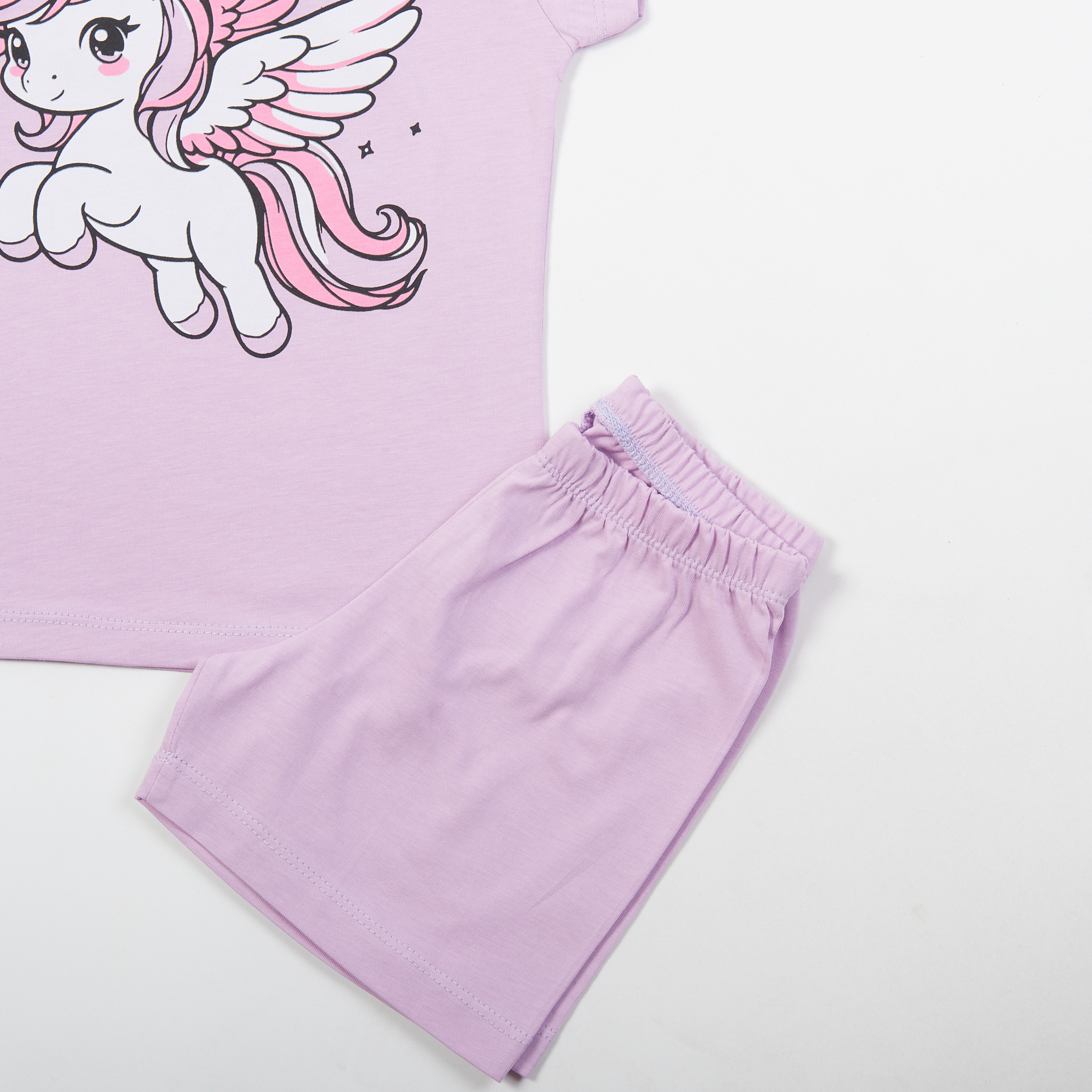 Πιτζάμα για κορίτσι 1-6 ετών, με μπλούζα σε λιλά χρώμα με τύπωμα και σορτς σε λιλά χρώμα.