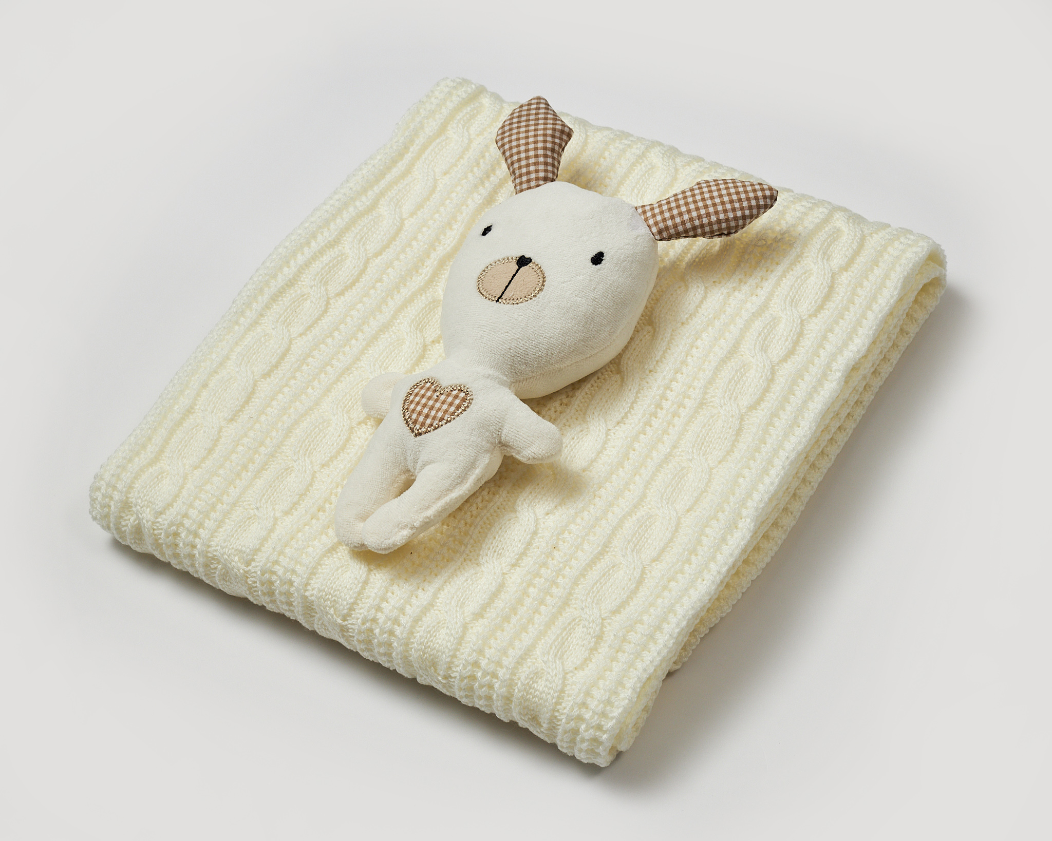 Πλεκτή κουβέρτα αγκαλιάς unisex, σε μπεζ χρώμα και αρκουδάκι λαγουδάκι.