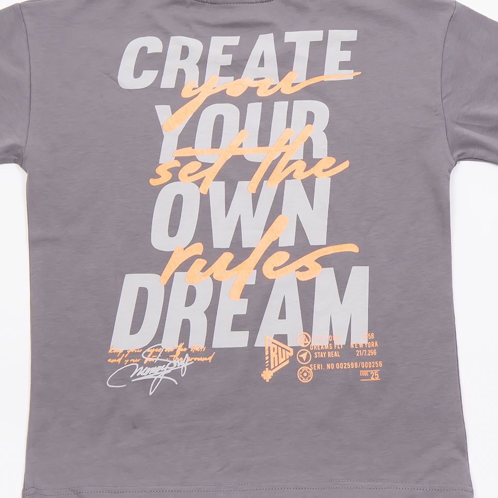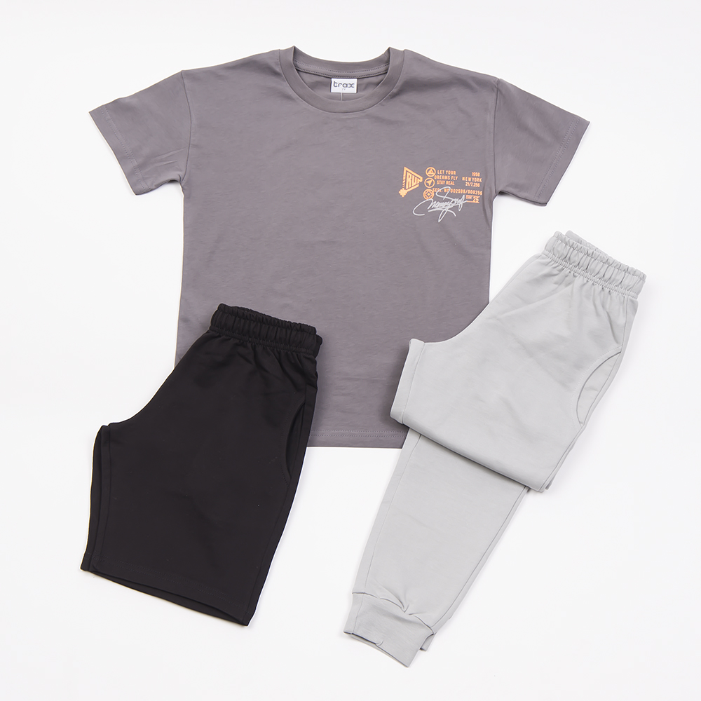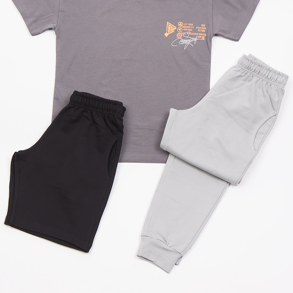 Σετ 3 τμχ με βερμούδα μακό σε μαύρο χρώμα, παντελόνι φόρμας χωρίς επένδυση σε γκρι χρώμα και μπλούζα μακό με κοντό μανίκι σε ανθρακί χρώμα με τύπωμα , για αγόρι 6-16 ετών.