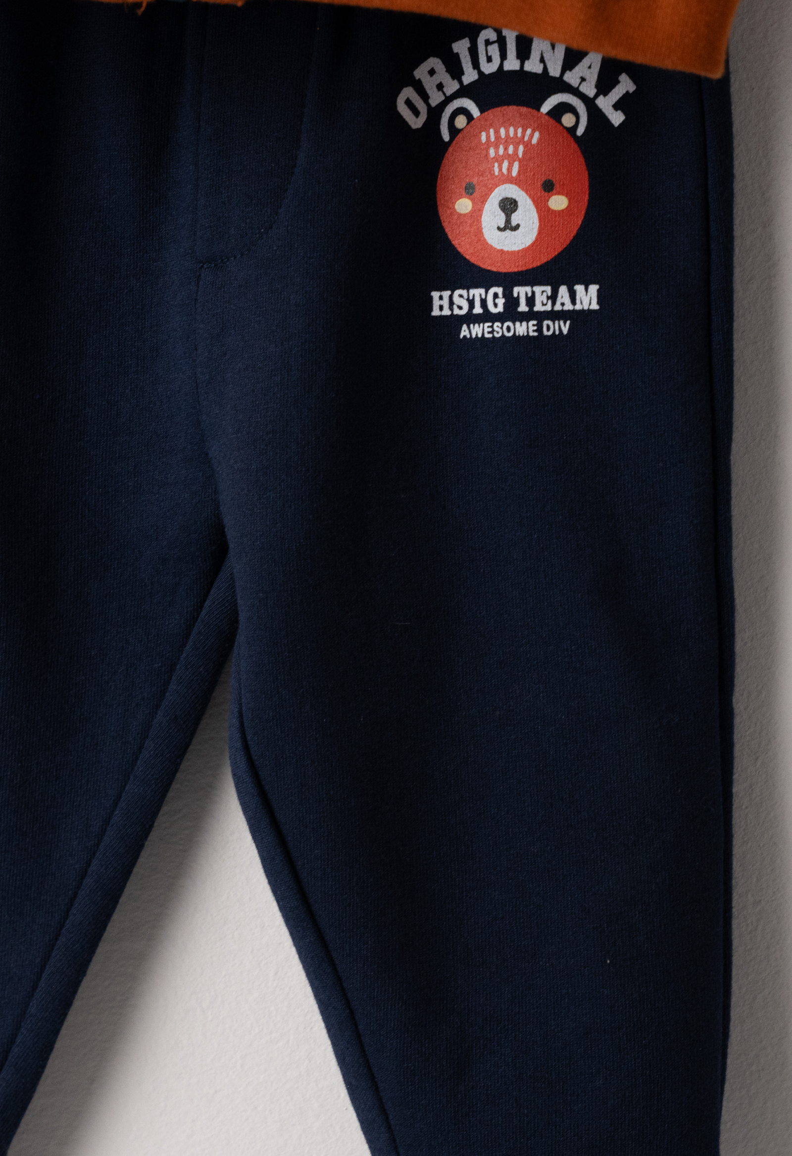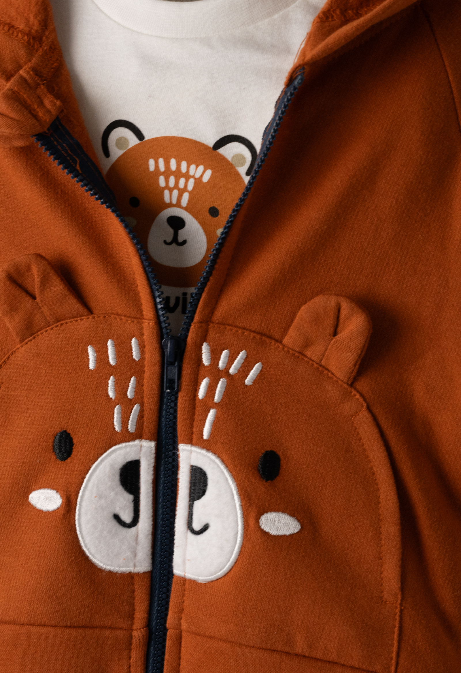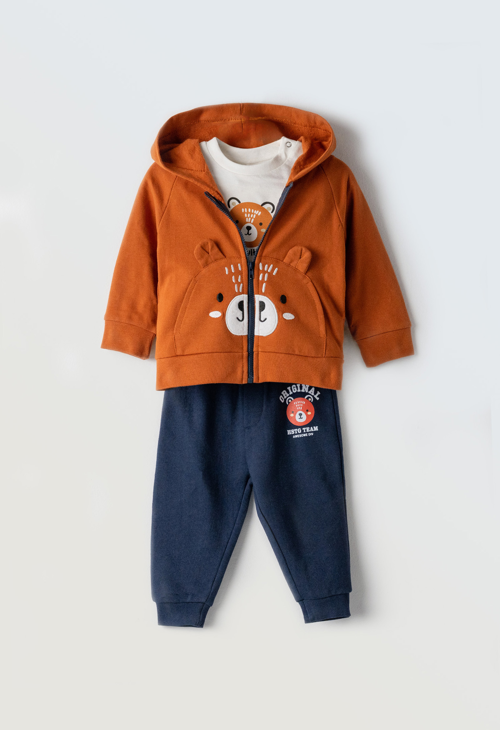 Σετ φόρμα  φούτερ 3 τμχ, για αγόρι 6-24 μηνών. Το σετ αποτελείται από ζακέτα σε καφέ χρώμα  και τύπωμα, μπλούζα σε εκρού χρώμα με τύπωμα και παντελόνι σε μπλε χρώμα