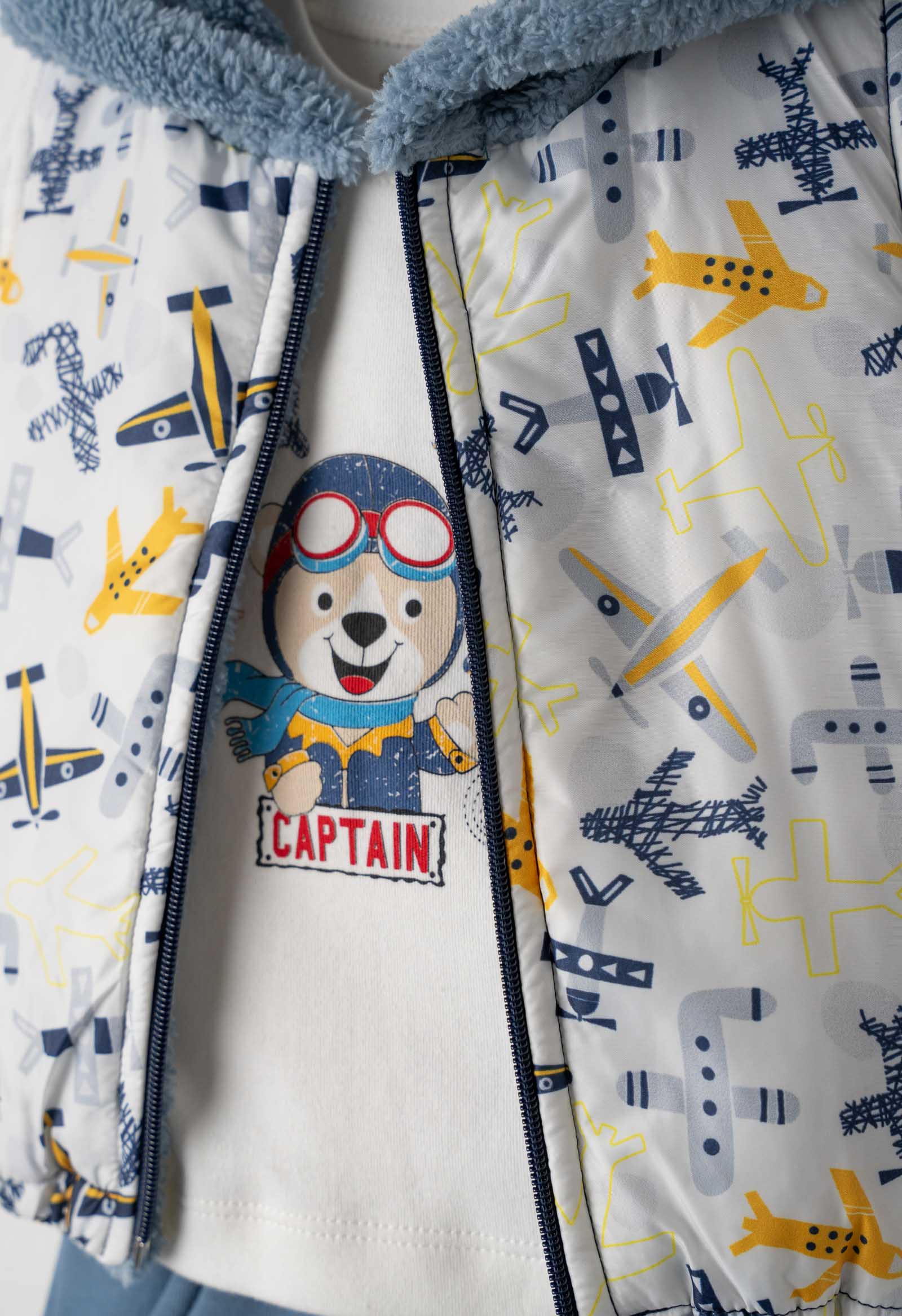 Σετ φόρμα 3 τμχ, για αγόρι 6-24 μηνών. Το σε αποτελείται από παντελόνι φόρμας φούτερ με επένδυση σε ρουά απόχρωση, μπλούζα σε λευκό χρώμα με τύπωμα και αμάνικο μπουφάν σε λευκό χρώμα με allover τύπωμα και ρουά λεπτομέρειες.