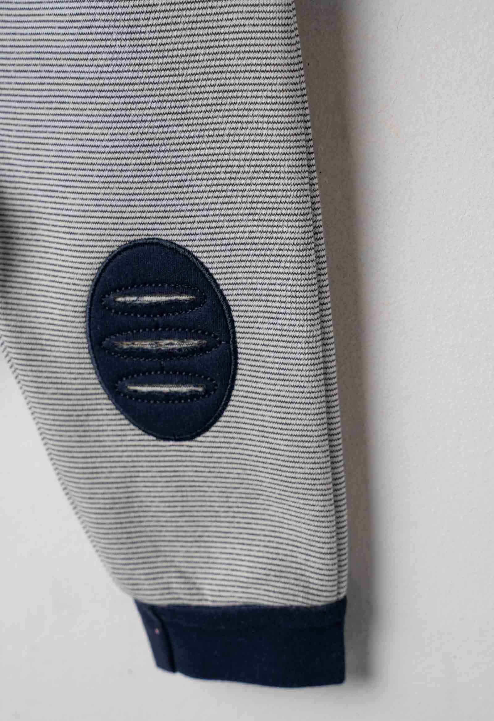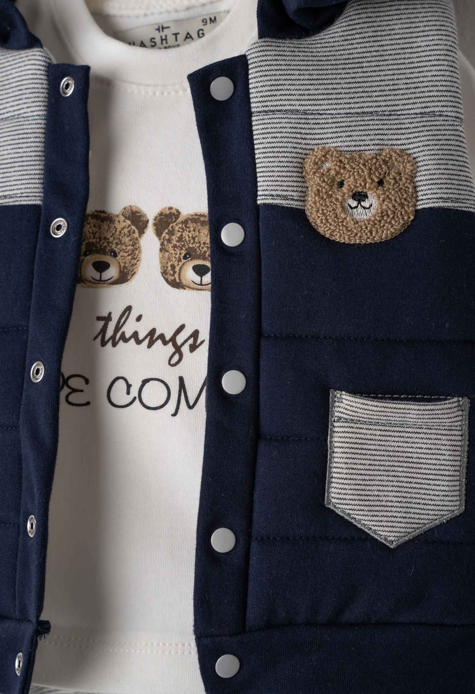 Σετ φόρμα 3 τμχ για αγόρι 6-24 μηνών. Το σετ αποτελείται από παντελόνι φόρμας σε μπλε – λευκό χρώμα ριγέ με σχέδιο, μπλούζα σε λευκό χρώμα με τύπωμα και αμάνικο γιλέκο με κουκούλα με ιδιαίτερο σχέδιο.