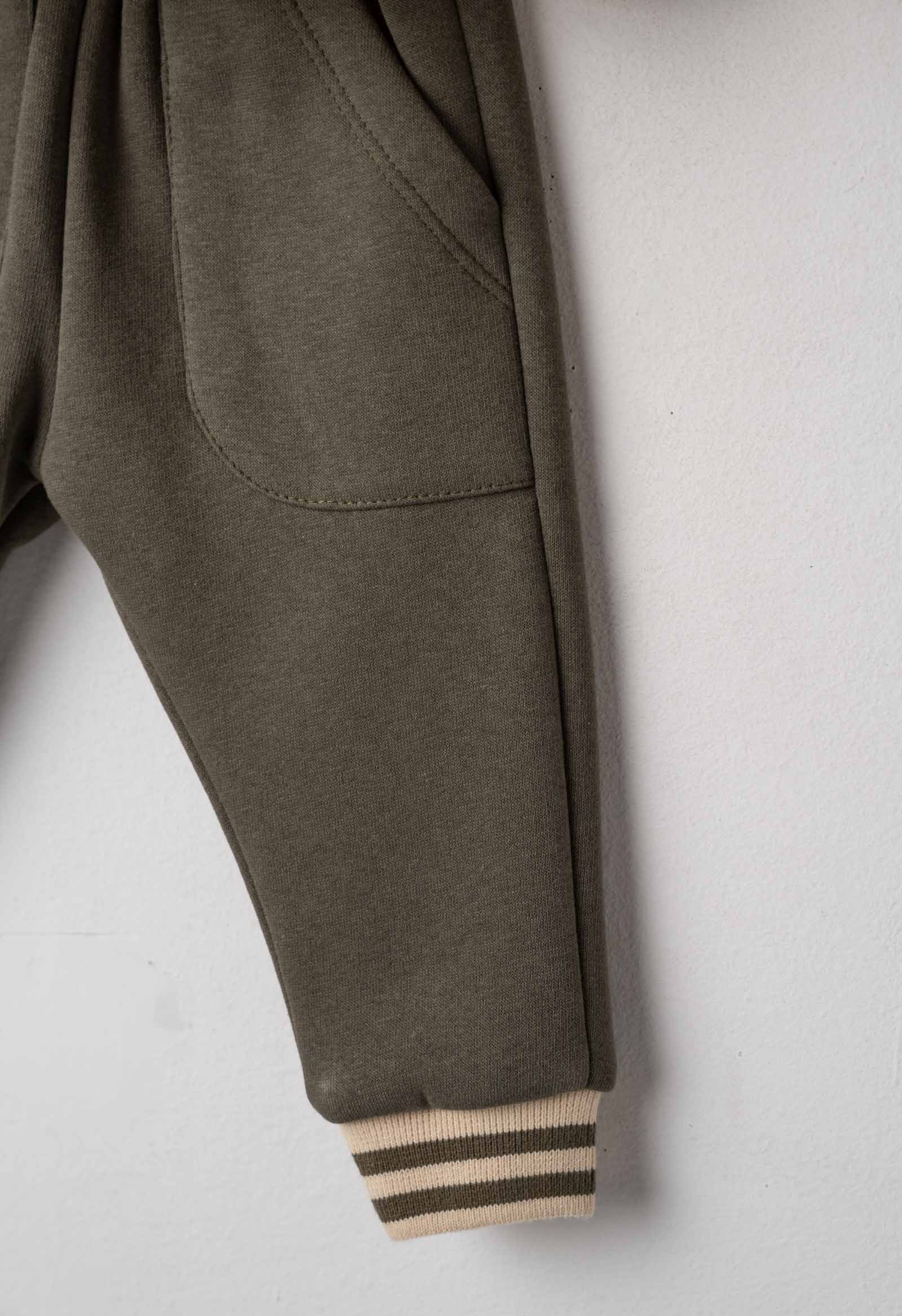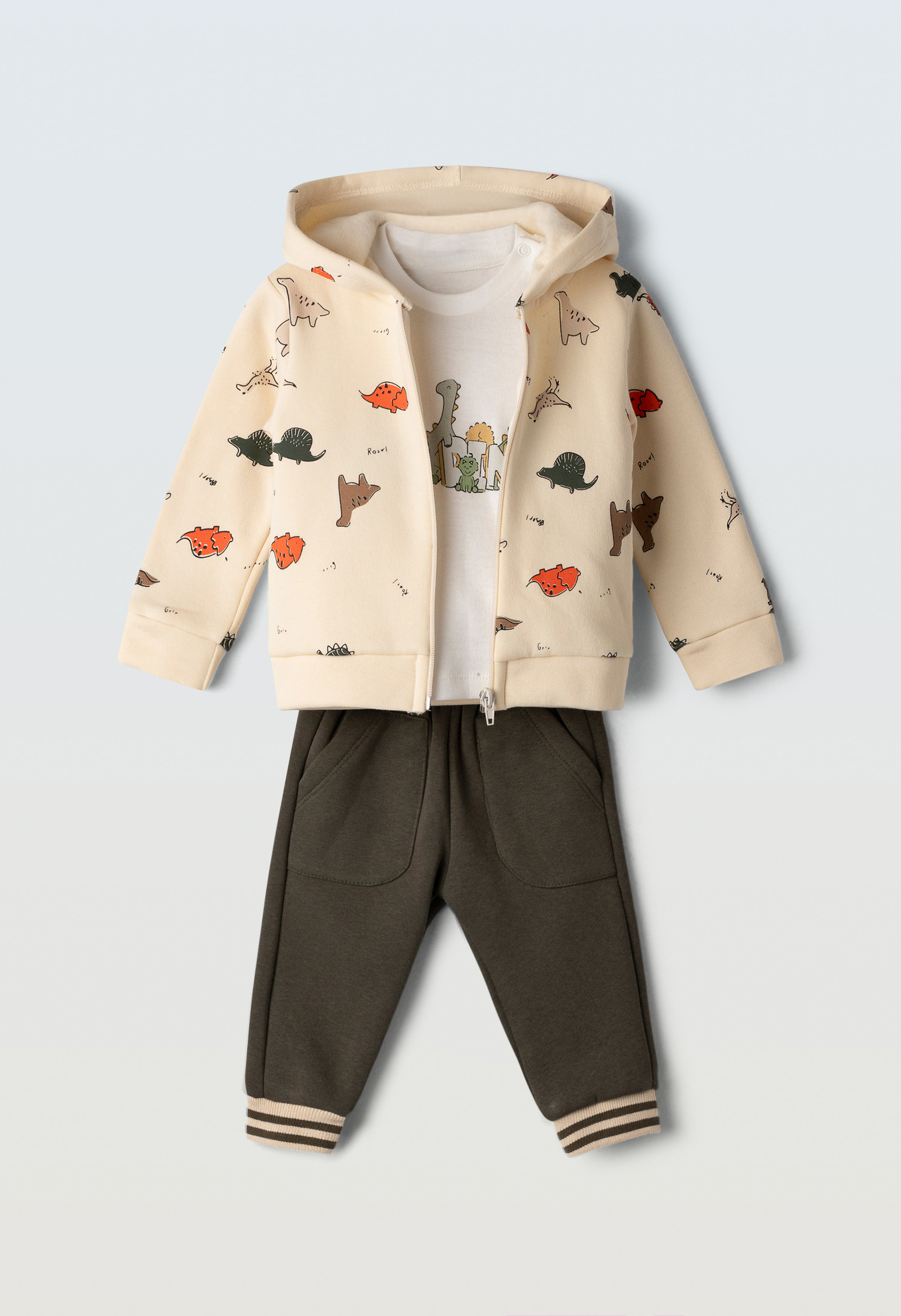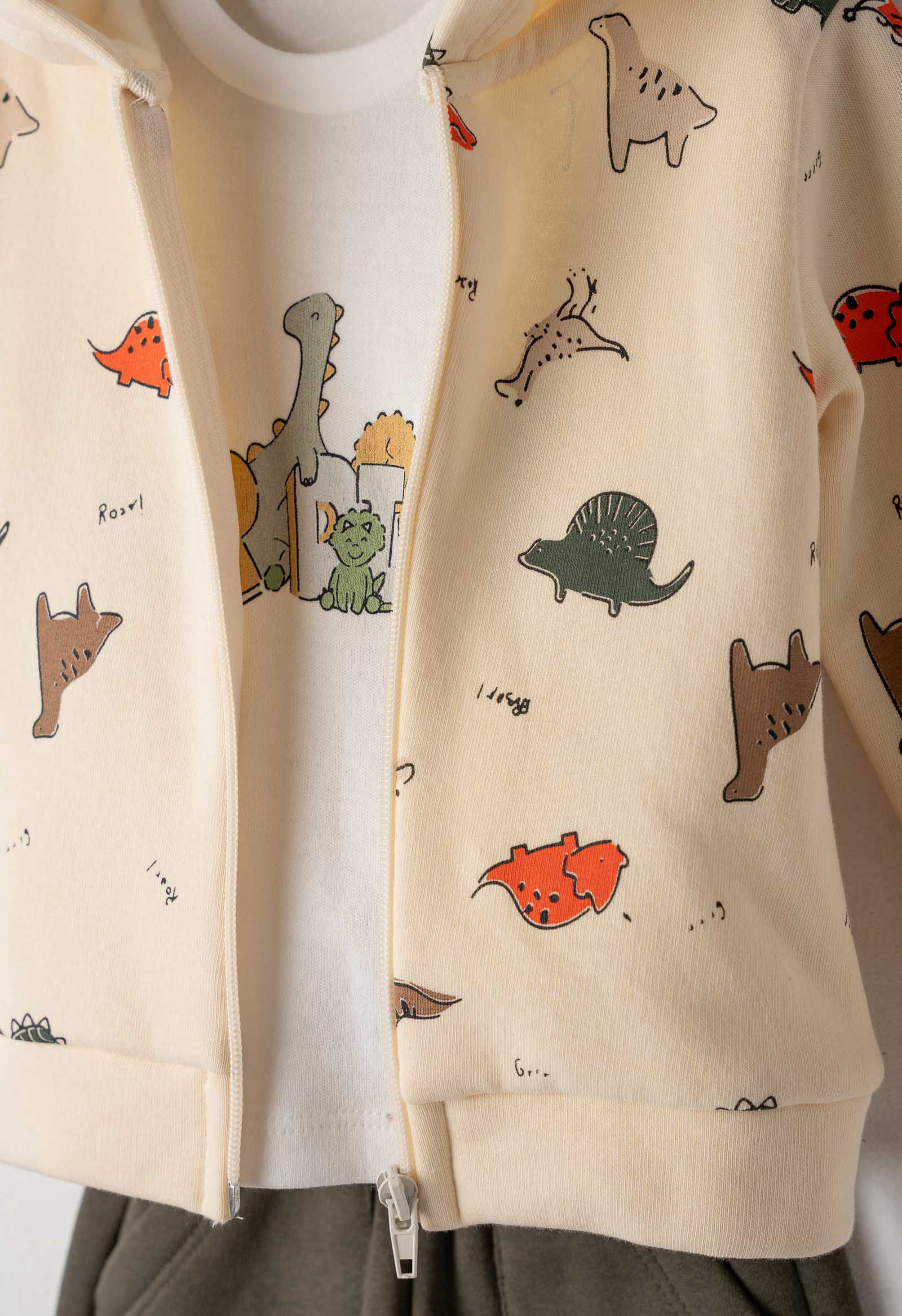 Σετ φόρμα 3 τμχ για αγόρι 6-24 μηνών. Το σετ αποτελείται από παντελόνι φόρμας με επένδυση φλις σε χακί χρώμα, μπλούζα σε λευκό χρώμα με τύπωμα και ζακέτα με κουκούλα σε κρεμ χρώμα και allover τύπωμα.