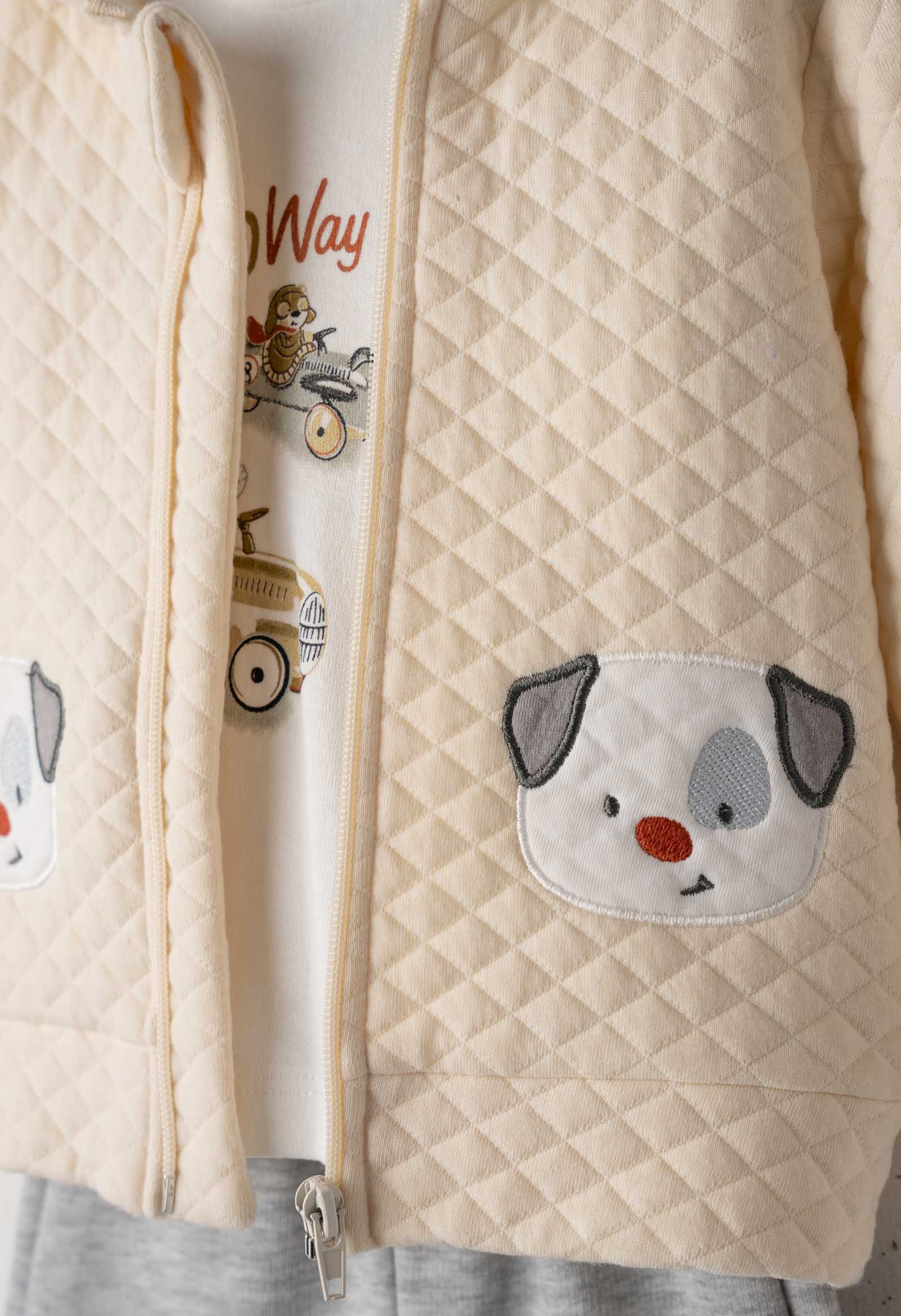 Σετ φόρμα 3 τμχ για αγόρι 6-24 μηνών. Το σετ αποτελείται από παντελόνι φόρμας φούτερ με επένδυση φλις σε γκρι χρώμα, μπλούζα σε λευκό χρώμα με τύπωμα και ζακέτα με κουκούλα σε κρεμα χρώμα με ιδιαίτερο σχέδιο.