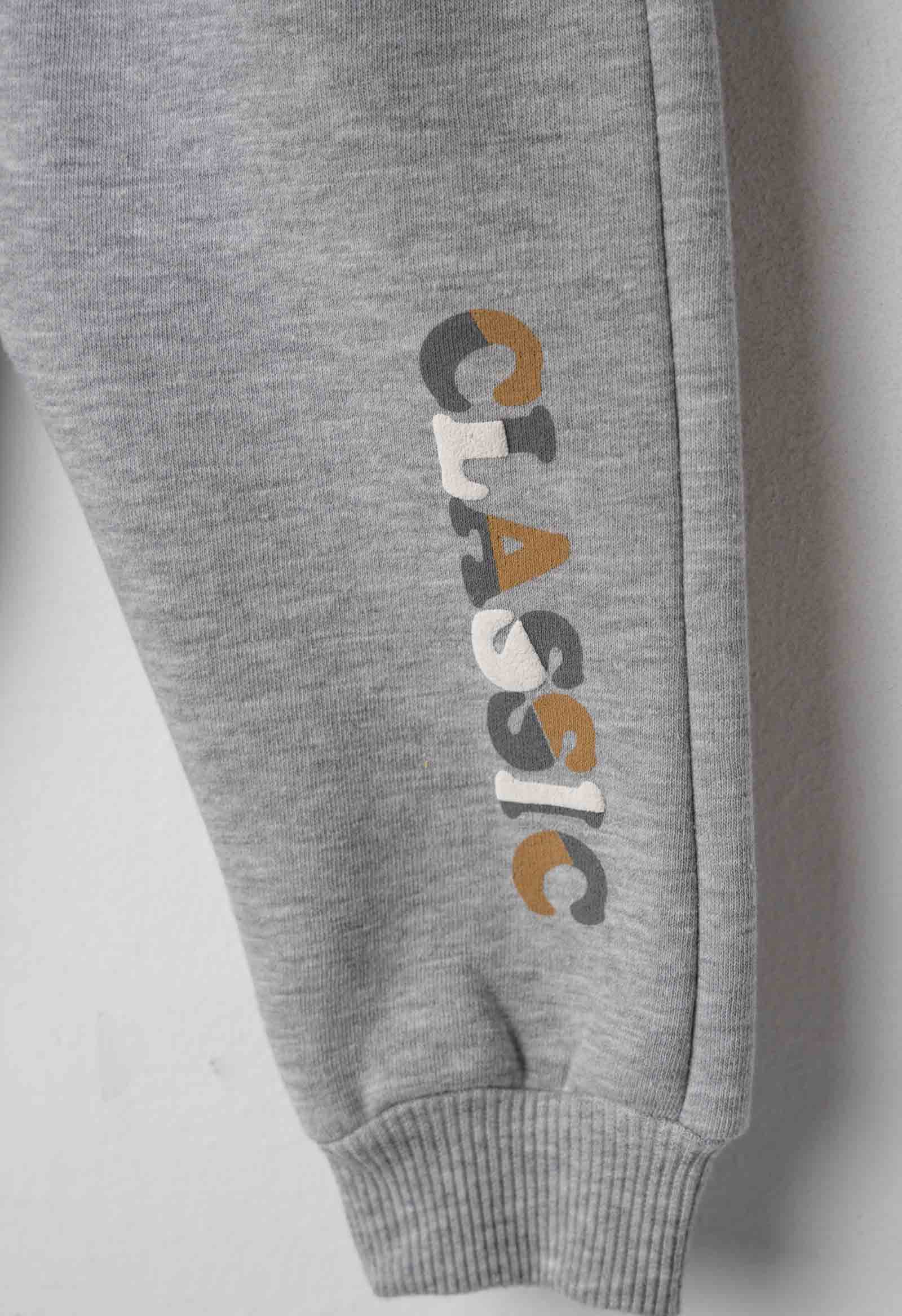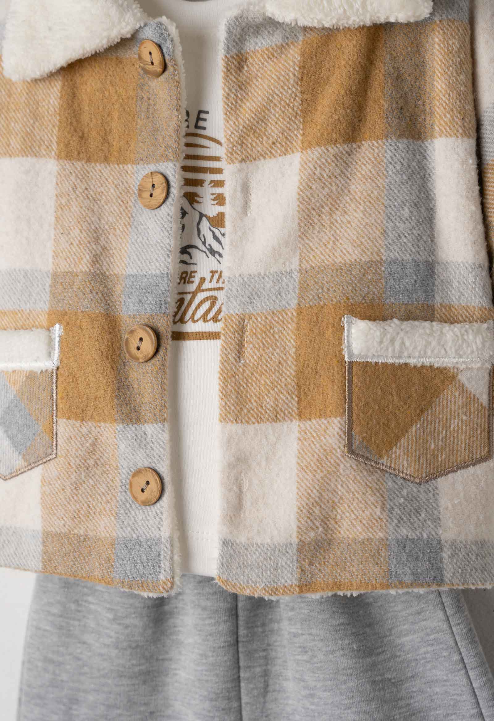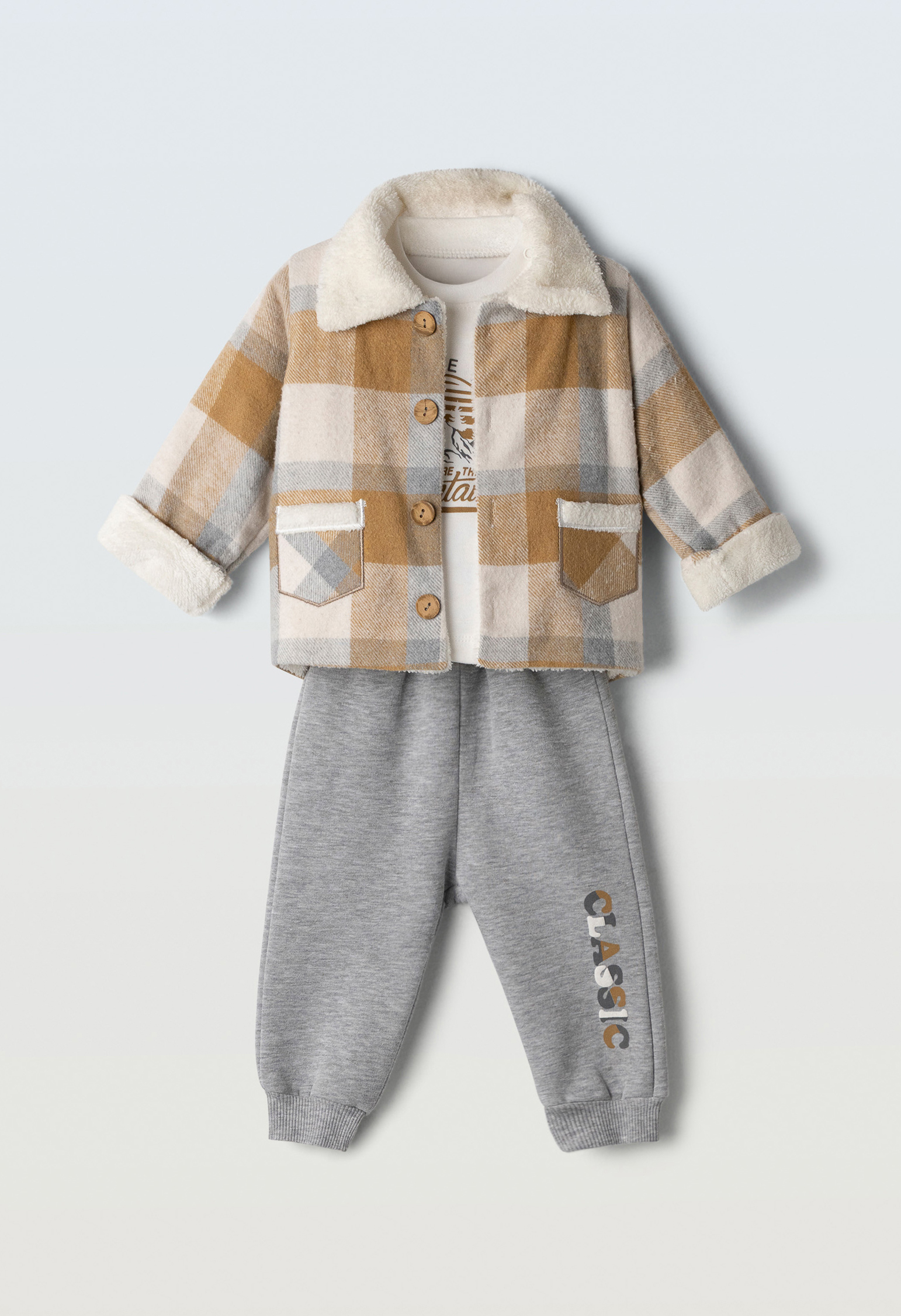 Σετ φόρμα 3 τμχ με ζακέτα για αγόρι 6-24 μηνών. Το σετ αποτελείται από παντελόνι φόρμας φούτερ με επένδυση σε γκρι χρώμα, μπλούζα σε εκρού χρώμα με τύπωμα και ζακέτα με επένδυση σε συνδυασμό χρωμάτων μπεζ, εκρού και γκρι σε σχέδιο καρό