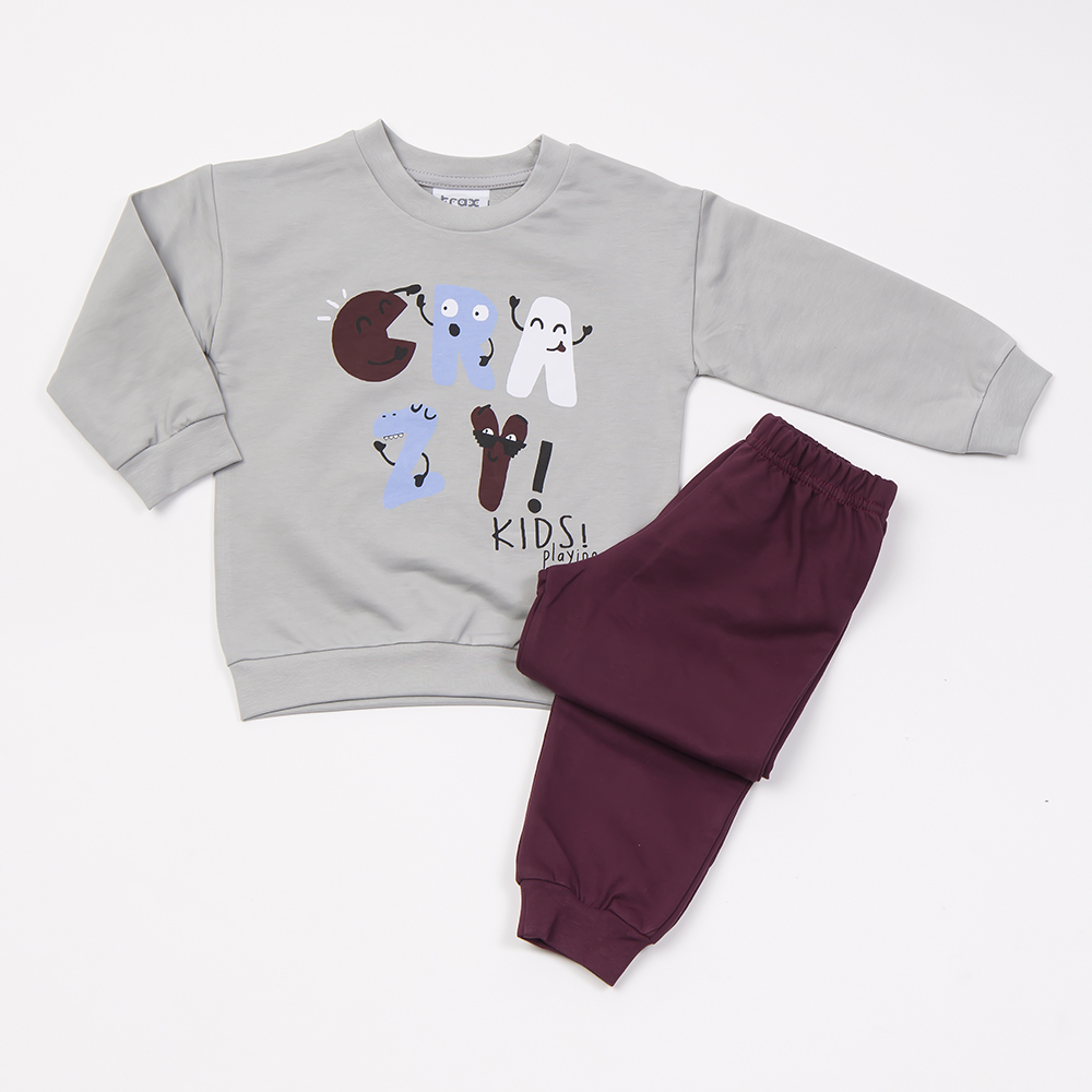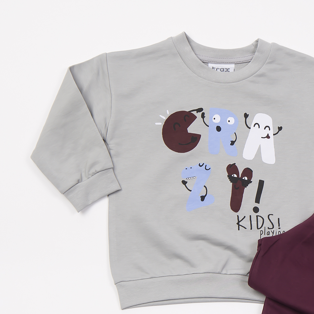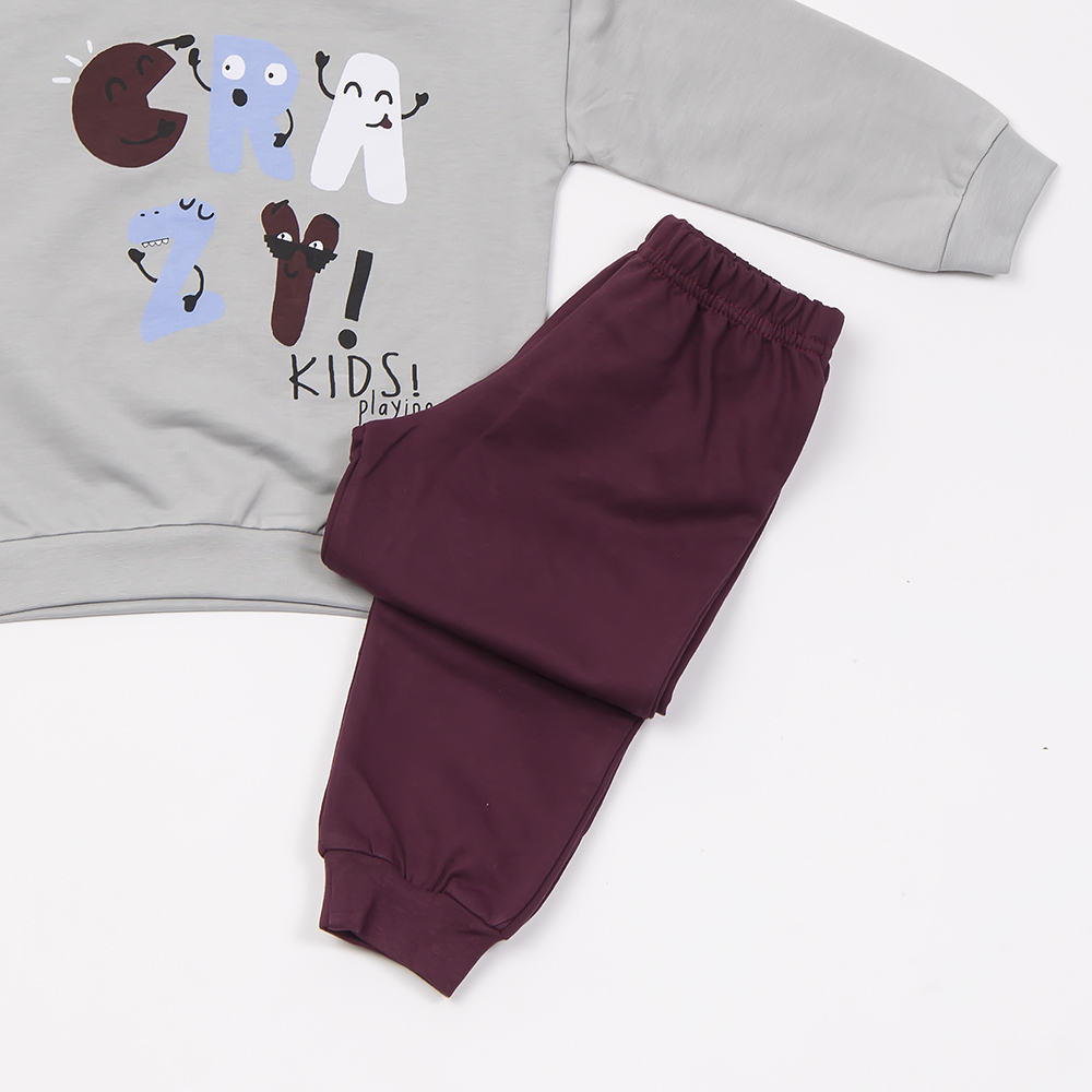 Σετ φόρμα εποχής (χωρίς επένδυση), με μπορντό παντελόνι φόρμας και μπλούζα σε γκρι χρώμα με τύπωμα, για αγόρι 1-6 ετών.