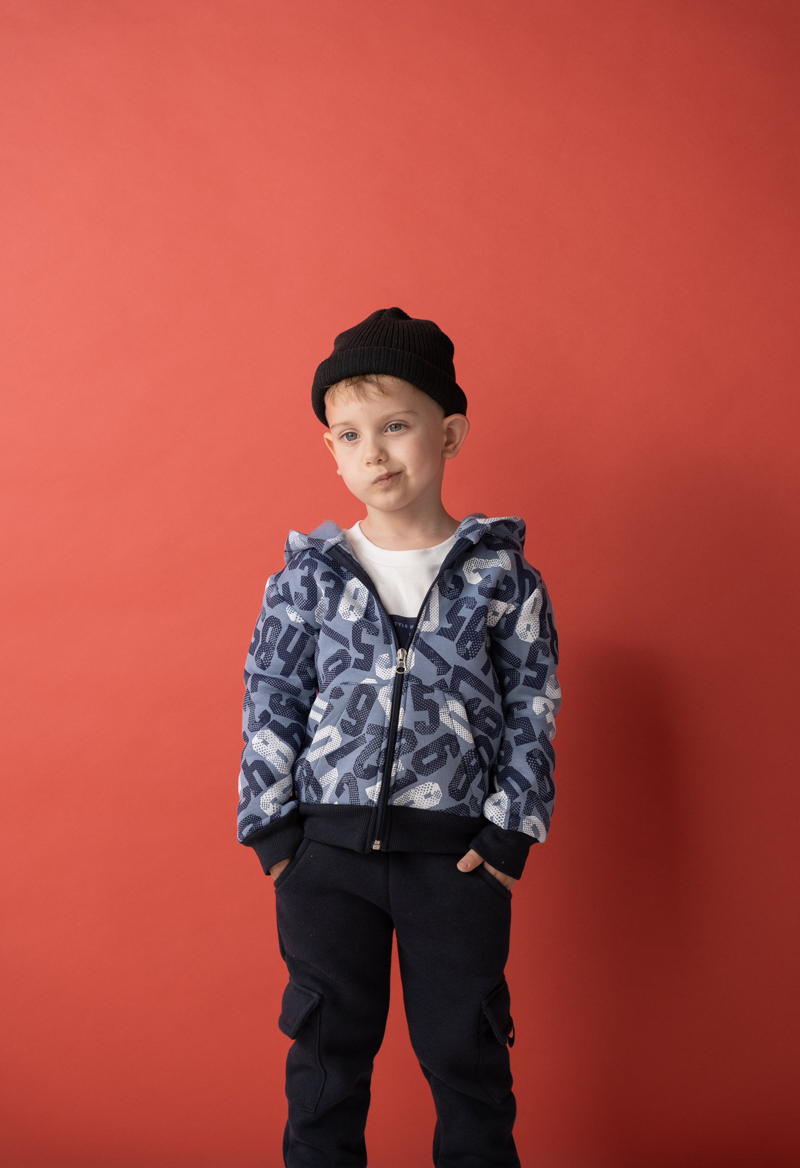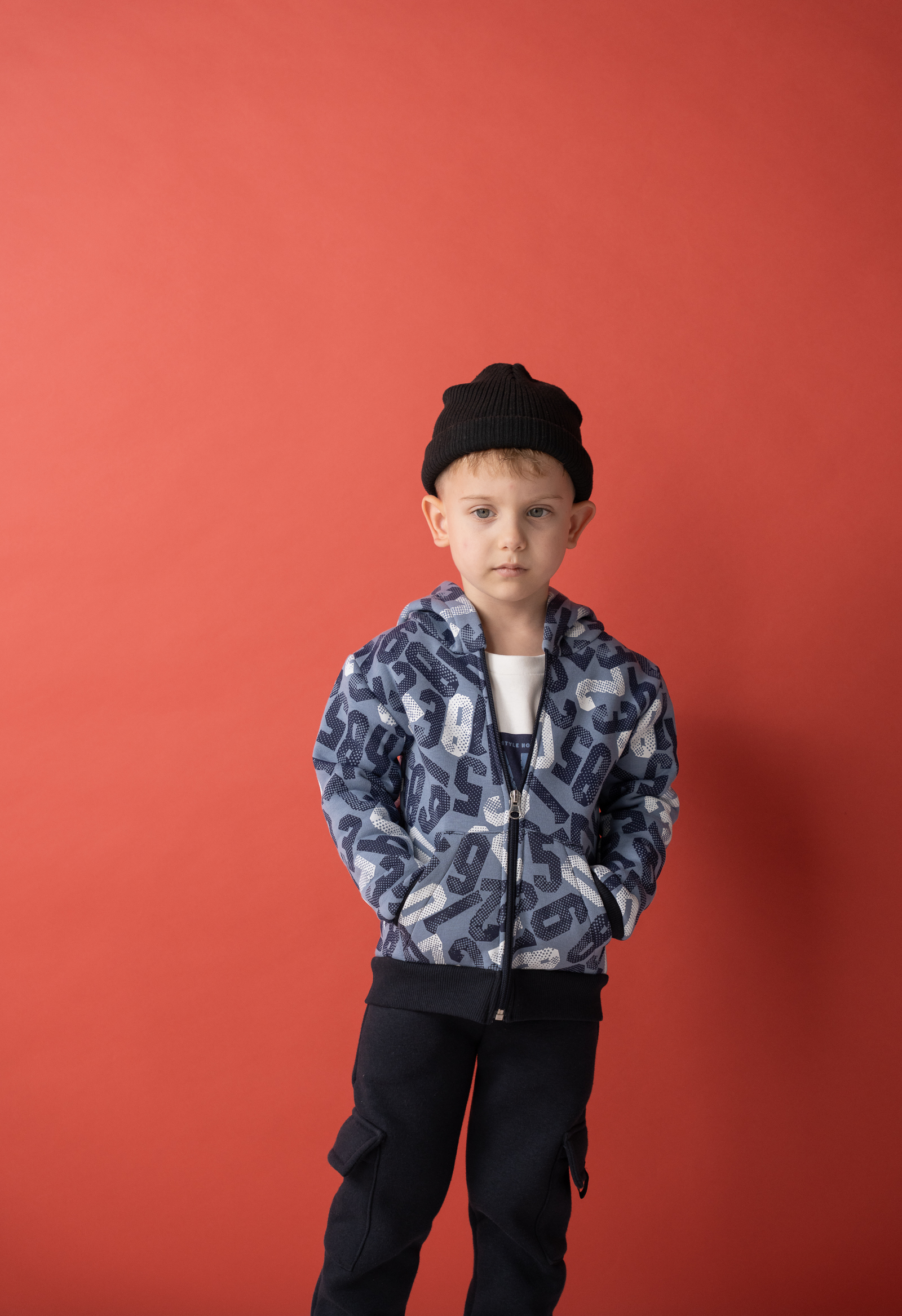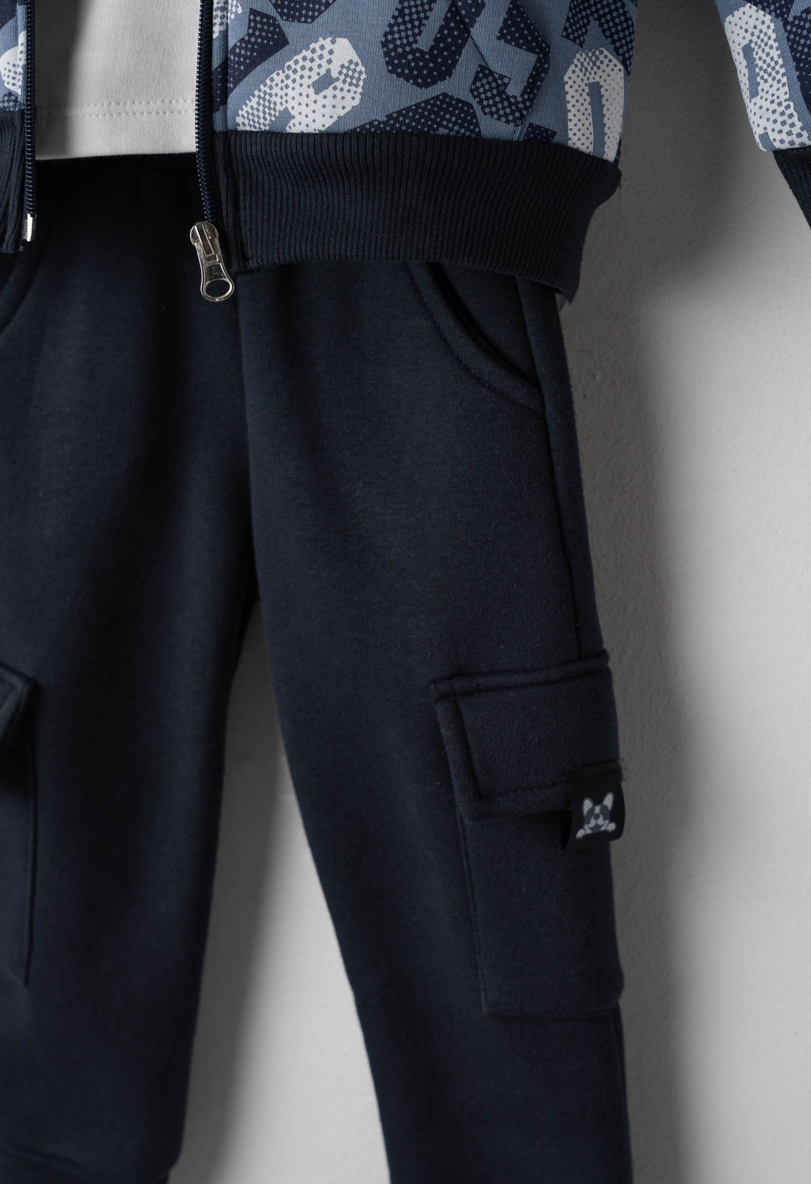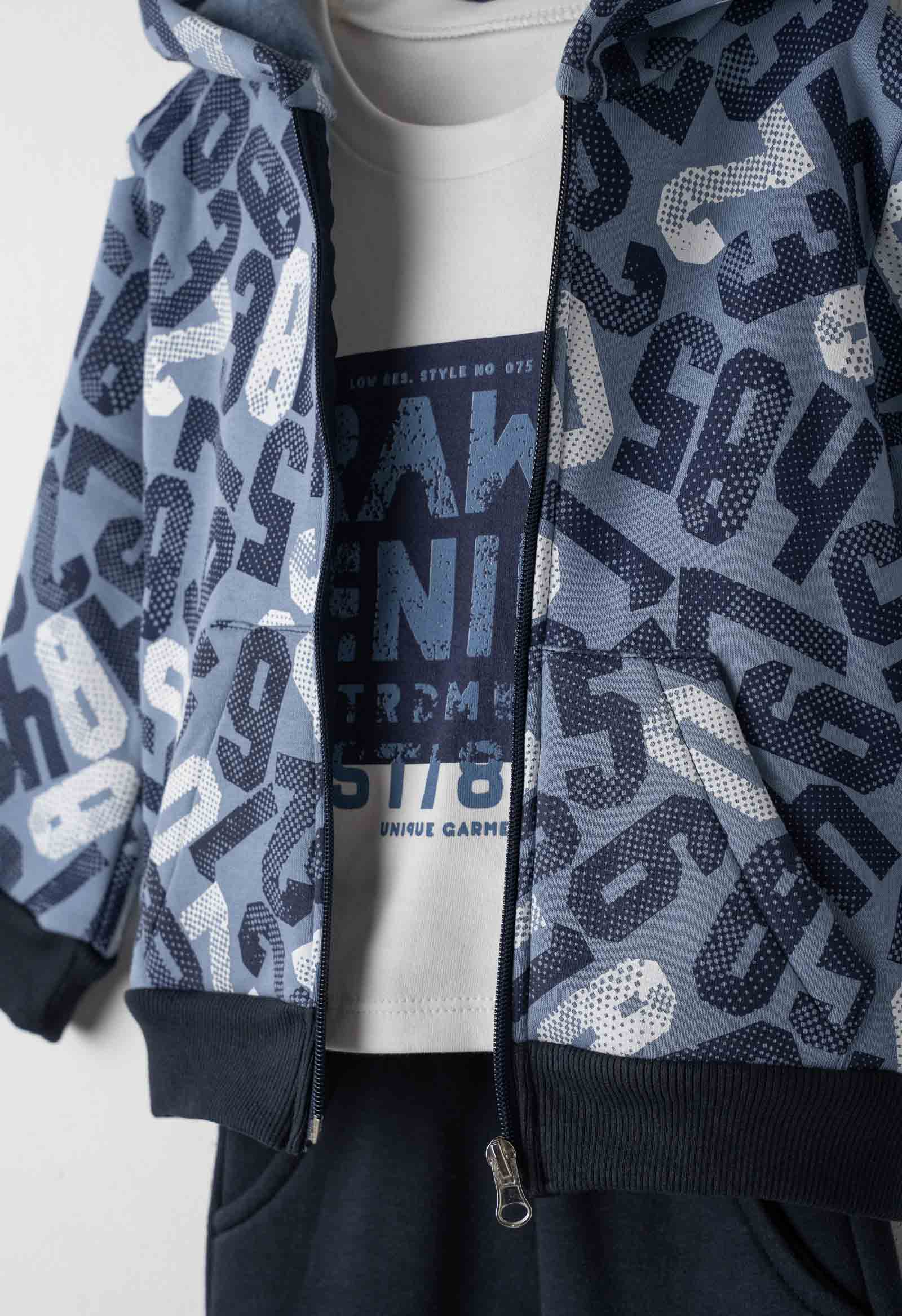 Σετ φόρμα 3 τμχ για αγόρι 1-6 ετών. Το σετ αποτελείται από παντελόνι φόρμας φούτερ με επένδυση φλις, cargo, σε μπλε χρώμα, μπλούζα σε λευκό χρώμα με τύπωμα και ζακέτα με κουκούλα σε μπλε χρώμα με allover τύπωμα.
