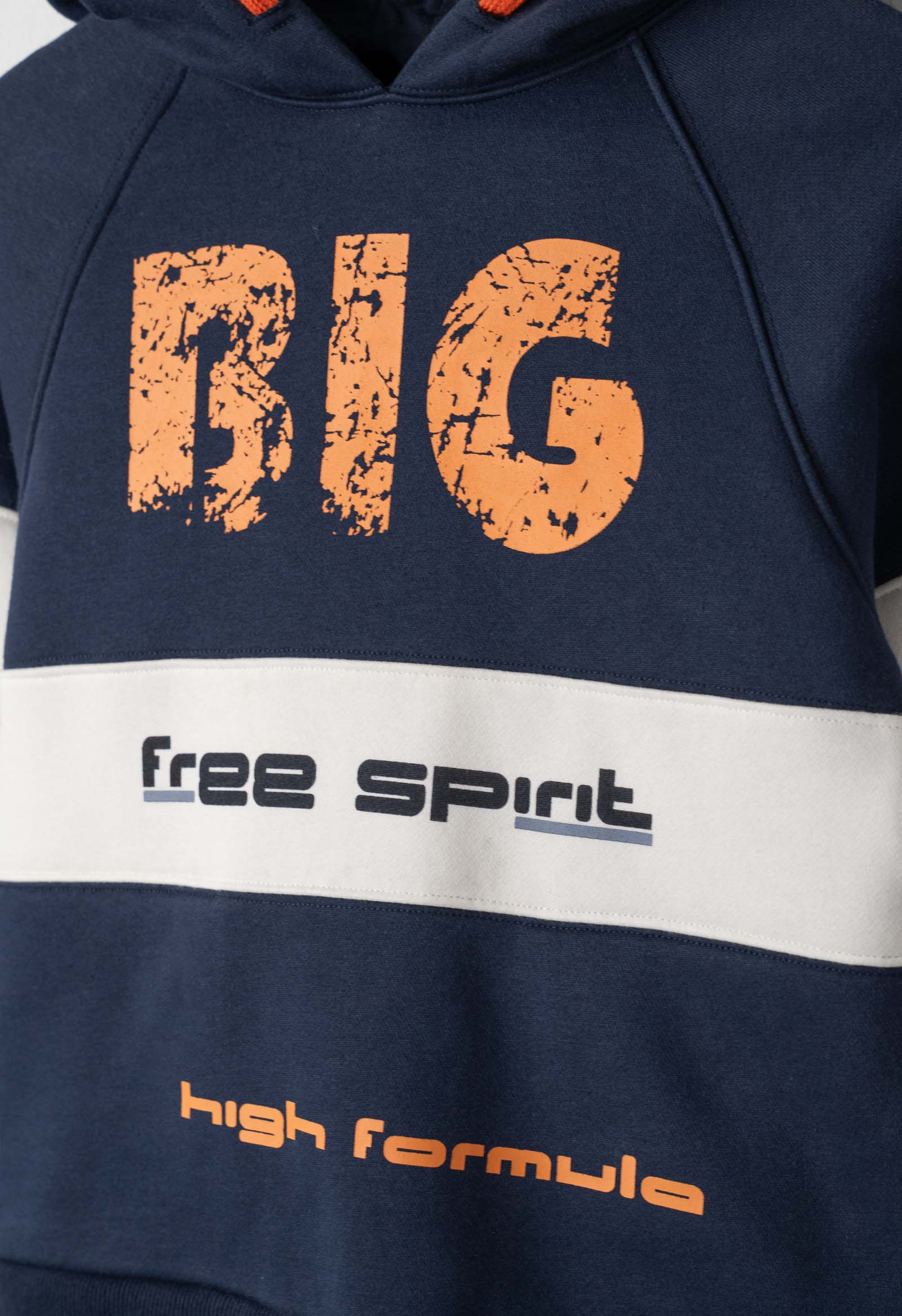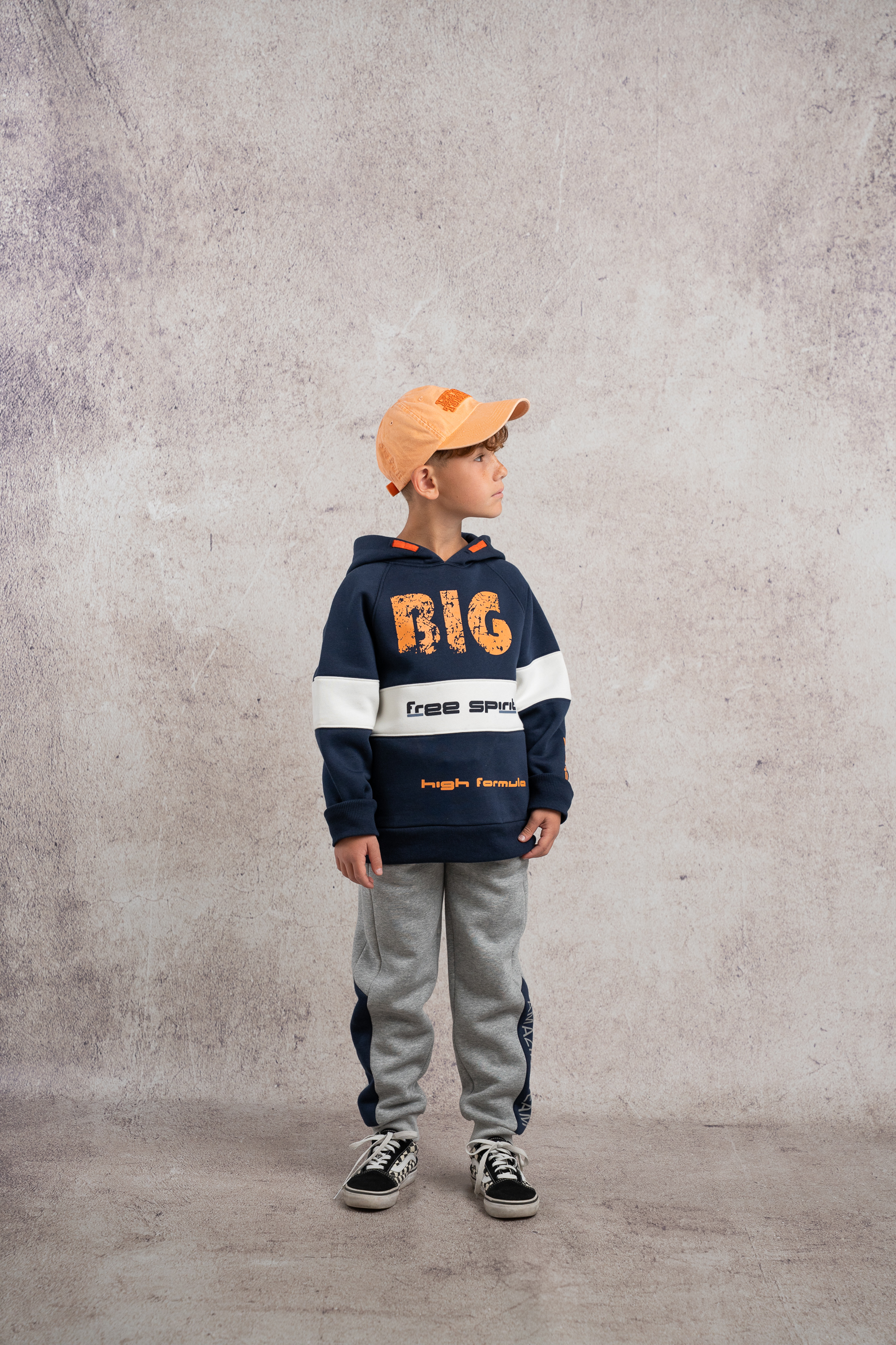 Σετ φόρμα φούτερ με κουκούλα, με επένδυση φλις, για αγόρι 6-16 ετών. Το σετ αποτελείται από παντελόνι φόρμας σε γκρι χρώμα και μπλούζα σε συνδυασμό χρώμάτων μπλε και λευκό με τύπωμα.
