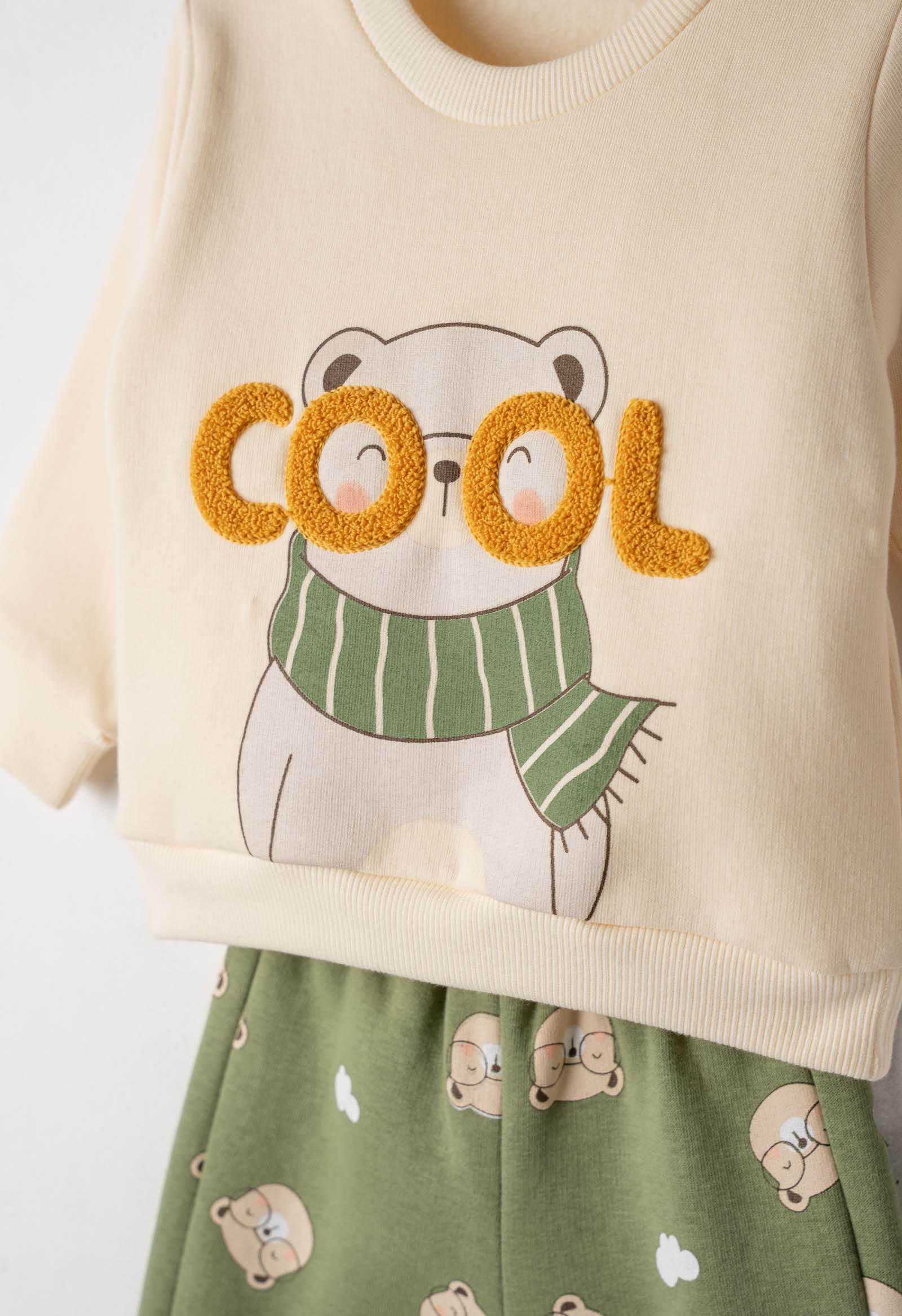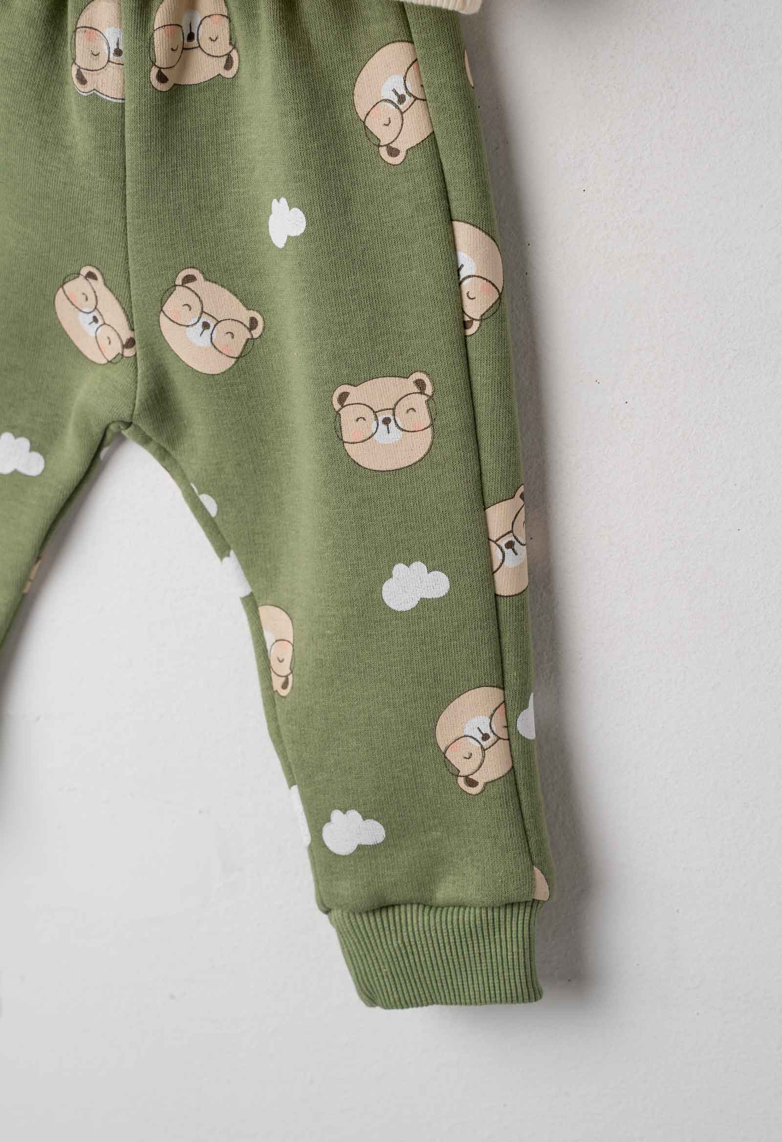 Σετ φόρμα φούτερ για αγόρι 6-24 μηνών. Το σετ αποτελείται από μπλούζα φούτερ σε κρεμ απόχρωση με σχέδιο και παντελόνι φόρμας φούτερ με επένδυση φλι2 σε χακί απόχρωση και allover τύπωμα.