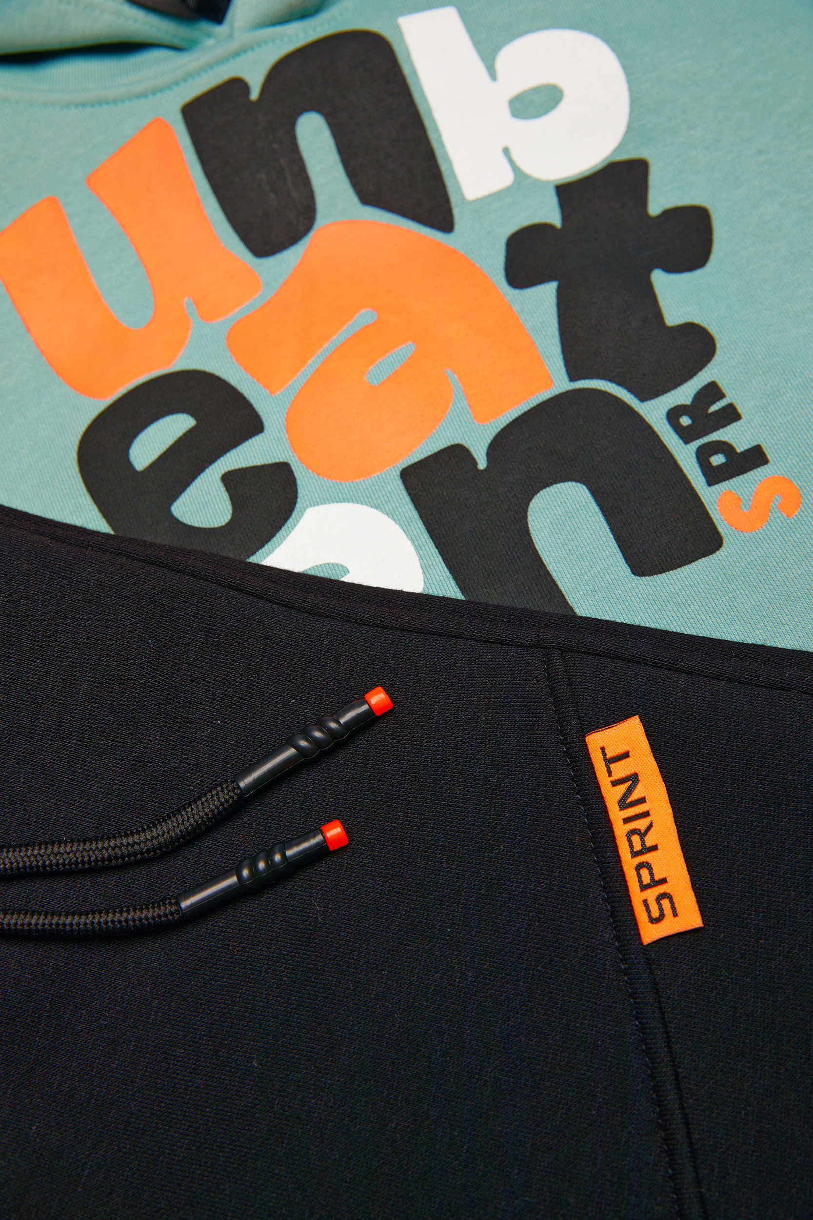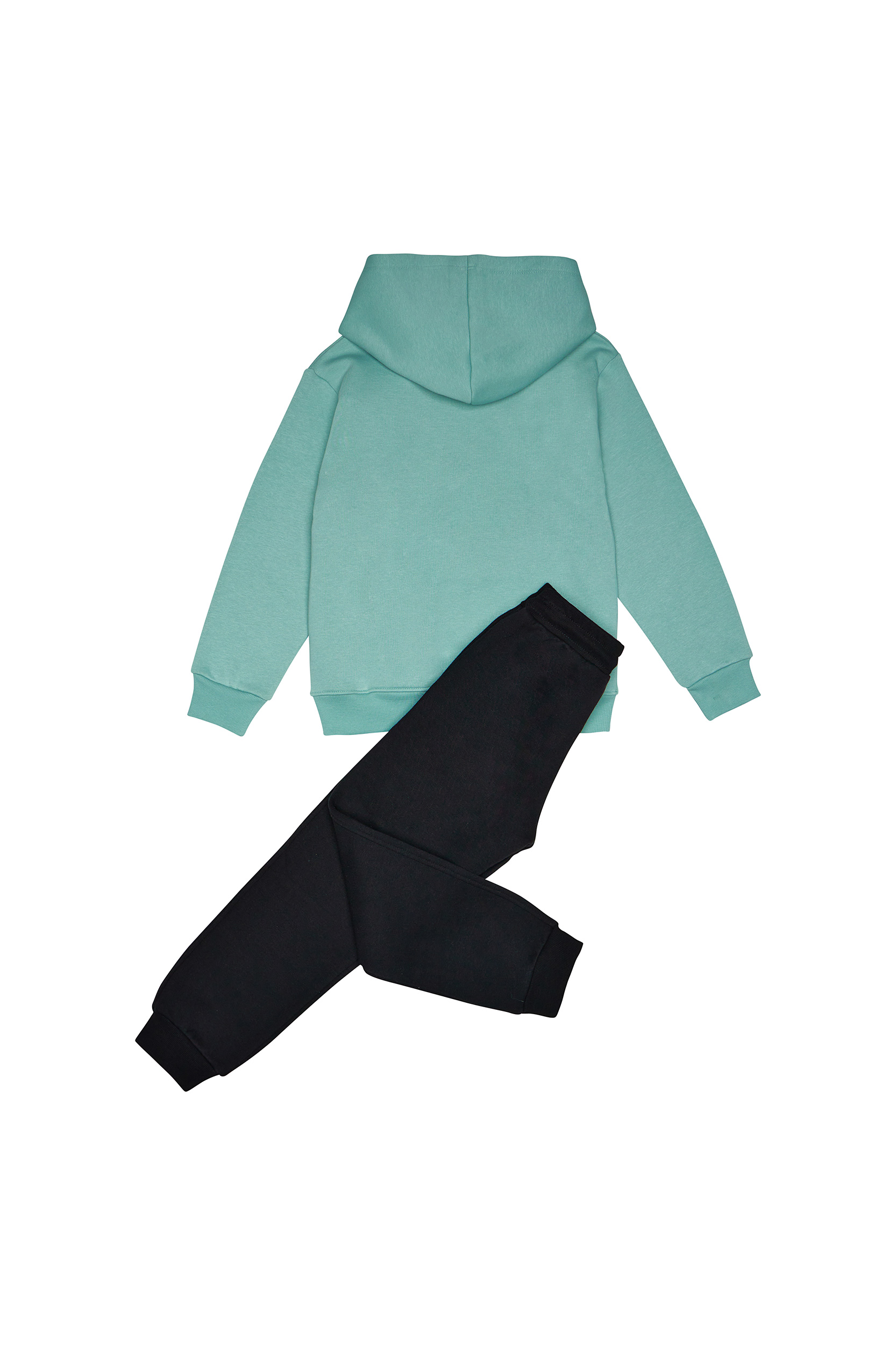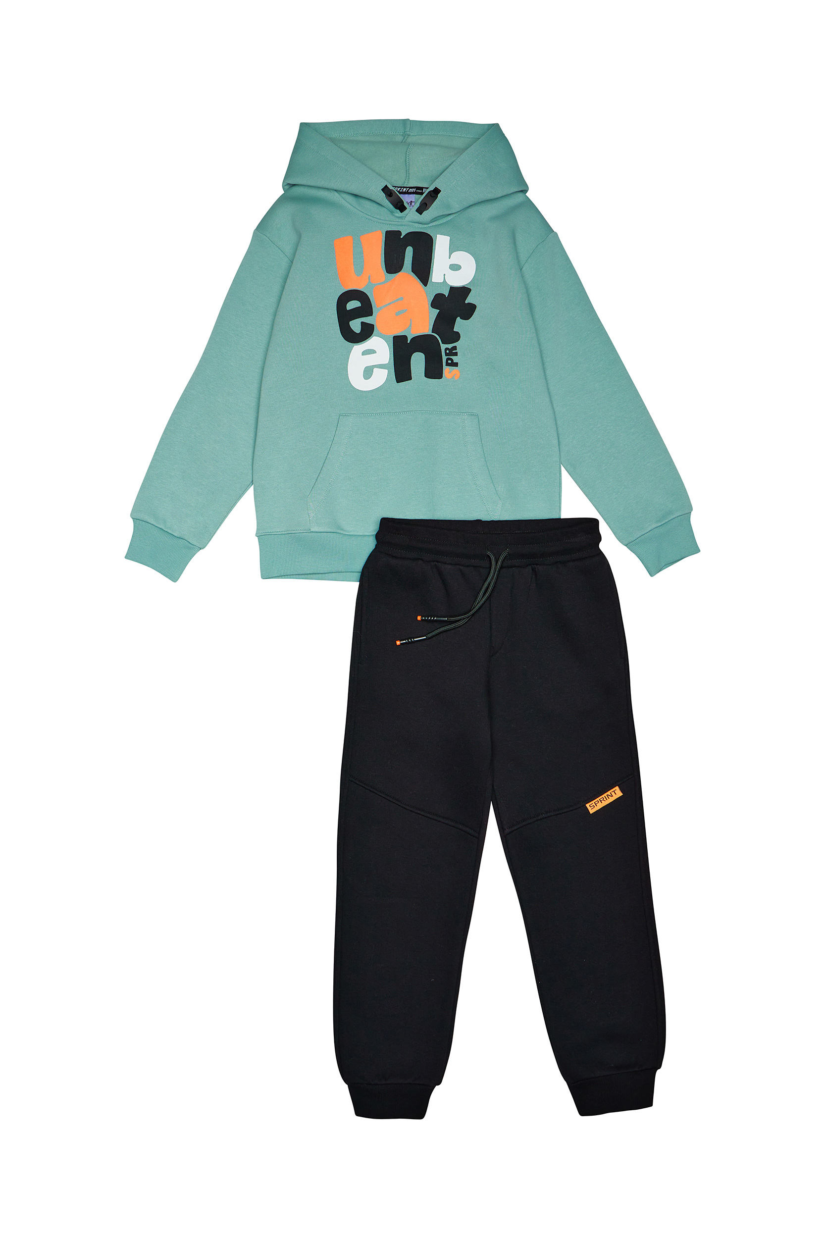 Σετ φόρμα φούτερ με επένδυση για αγόρι 6-16 ετών. Το σετ αποτελείται από μπλούζα φούτερ  και κουκούλα στο χρώμα της μέντας και παντελόνι φόρμας φούτερ σε μαύρο χρώμα.