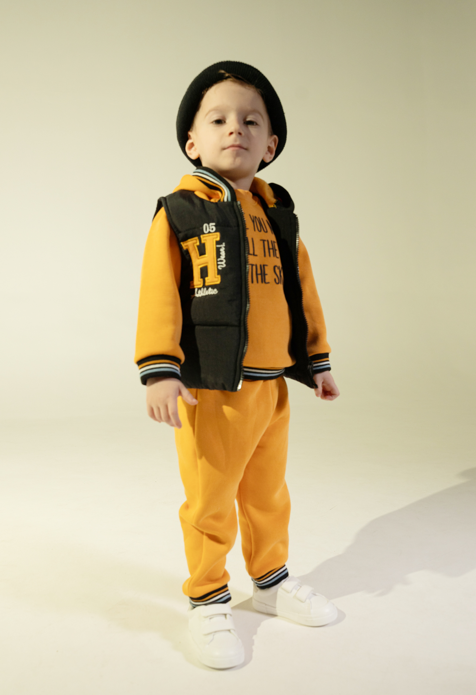 Σετ φόρμα με επένδυση φλις για αγόρι 6-24 μηνών. Το σετ αποτελείται από μπλούζα φούτερ με κουκούλα σε κίτρινο χρώμα με τύπωμα, παντελόνι φόρμας φούτερ σε κίτρινο χρώμα και αμάνικο μπουφάν σε μαύρο χρώμα.