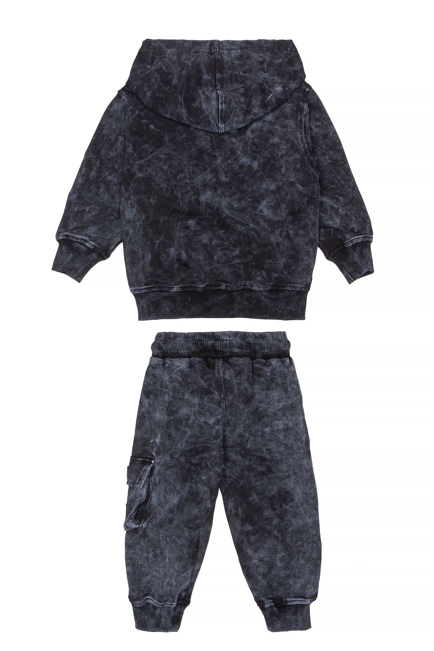 Σετ φόρμα φούτερ για αγόρι 1-6 ετών. Το σετ αποτελείται από παντελόνι cargo και μπλούζα με κουκούλα και τσέπες στο μπροστινό μέρος, σε μαύρο χρώμα με allover τύπωμα.