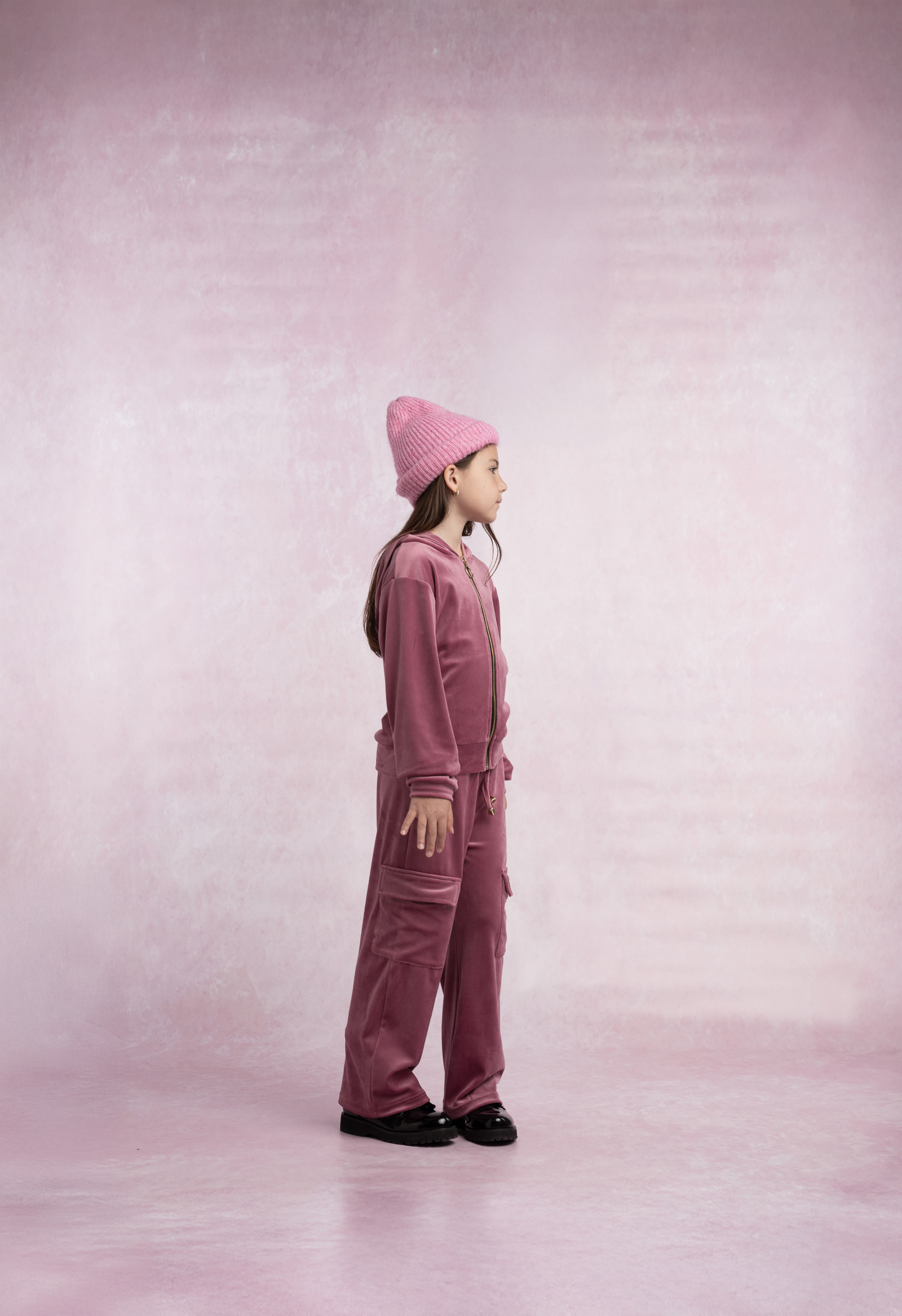 Σετ φόρμα βελουτέ με ζακέτα σε δύο αποχρώσεις – λιλά και μπεζ- , για κορίτσι 6-16 ετών.