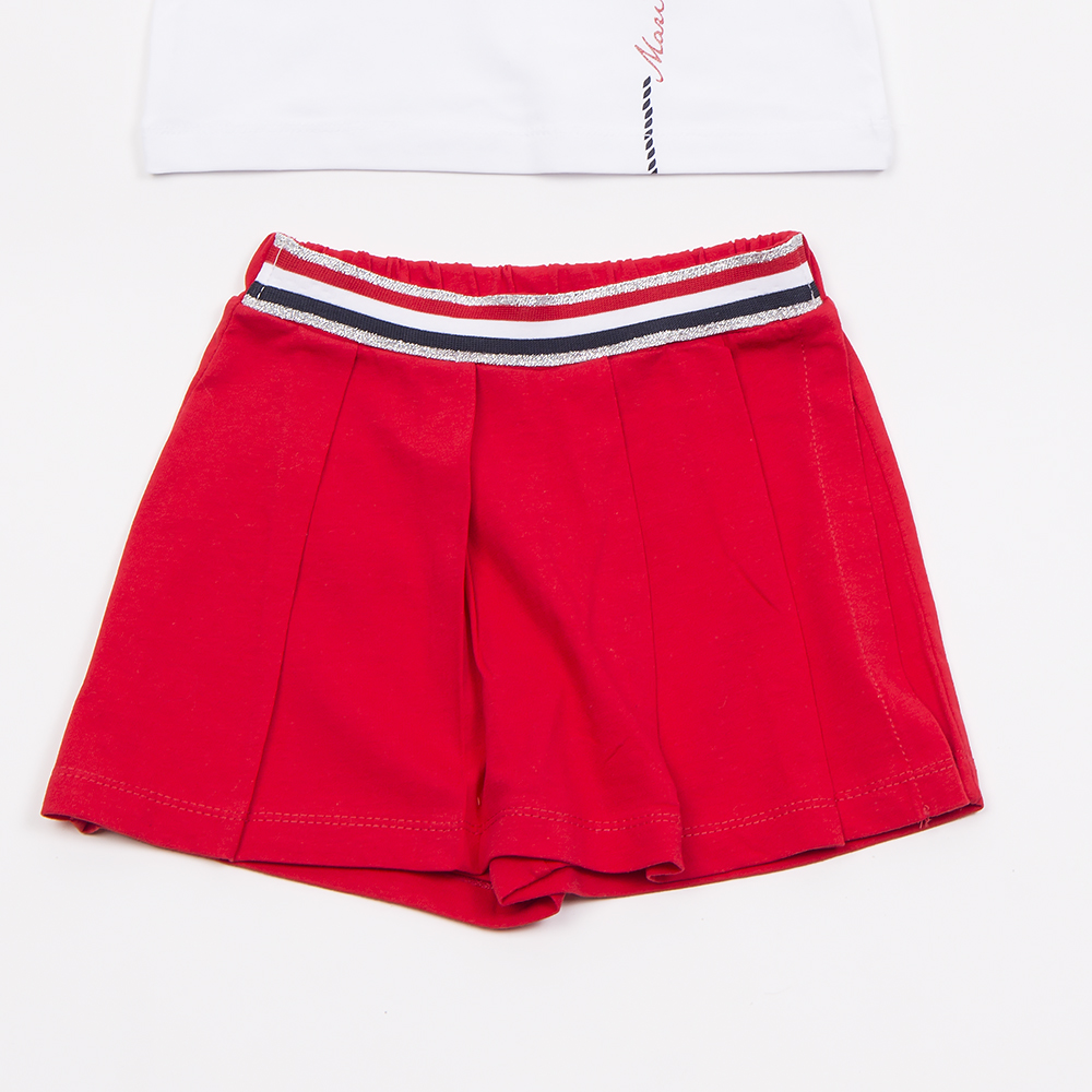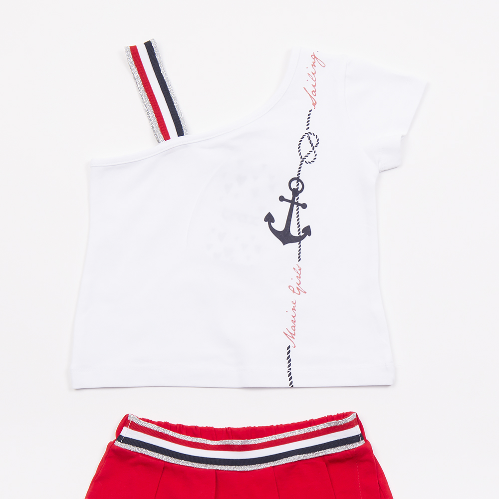 Σετ φούστα σορτς με πλισέ λεπτομέρειες, σε κόκκινο χρώμα και τοπ με κοντό μανίκι και τιράντα από την μια πλευρά σε λευκό χρώμα με ιδιαίτερο τύπωμα, για κορίτσι 1-6 ετών.