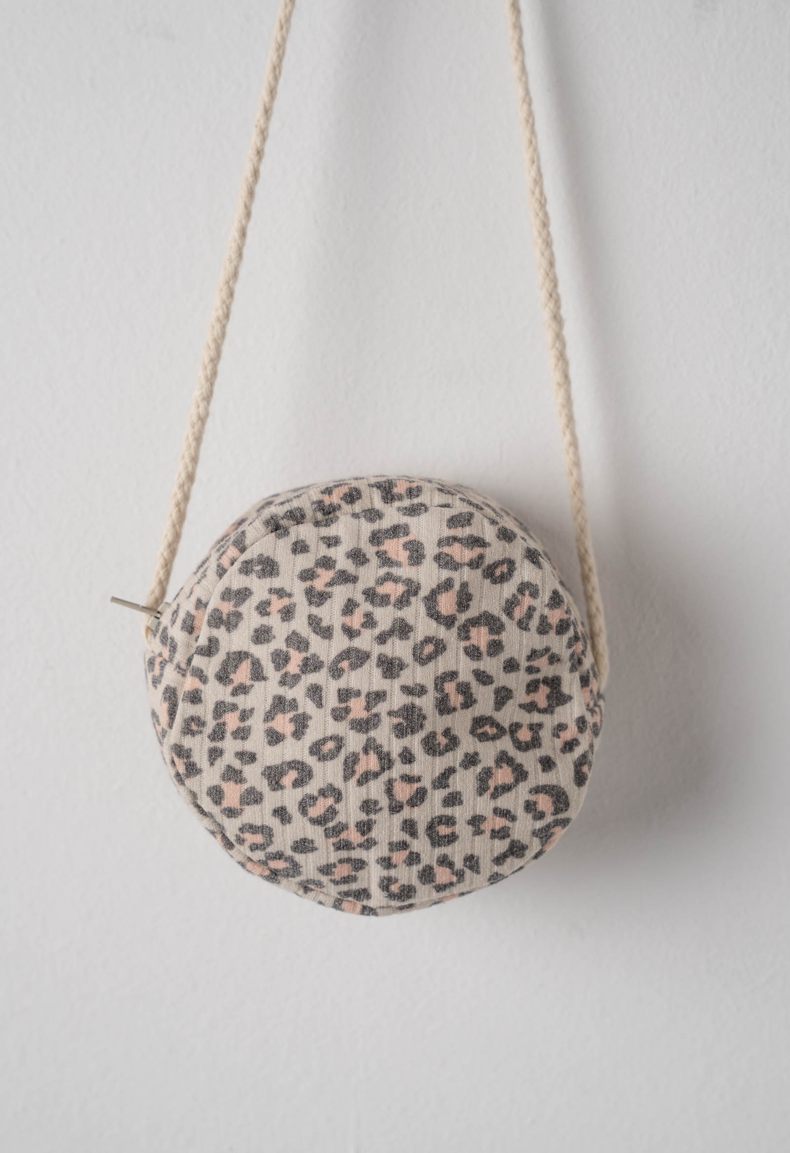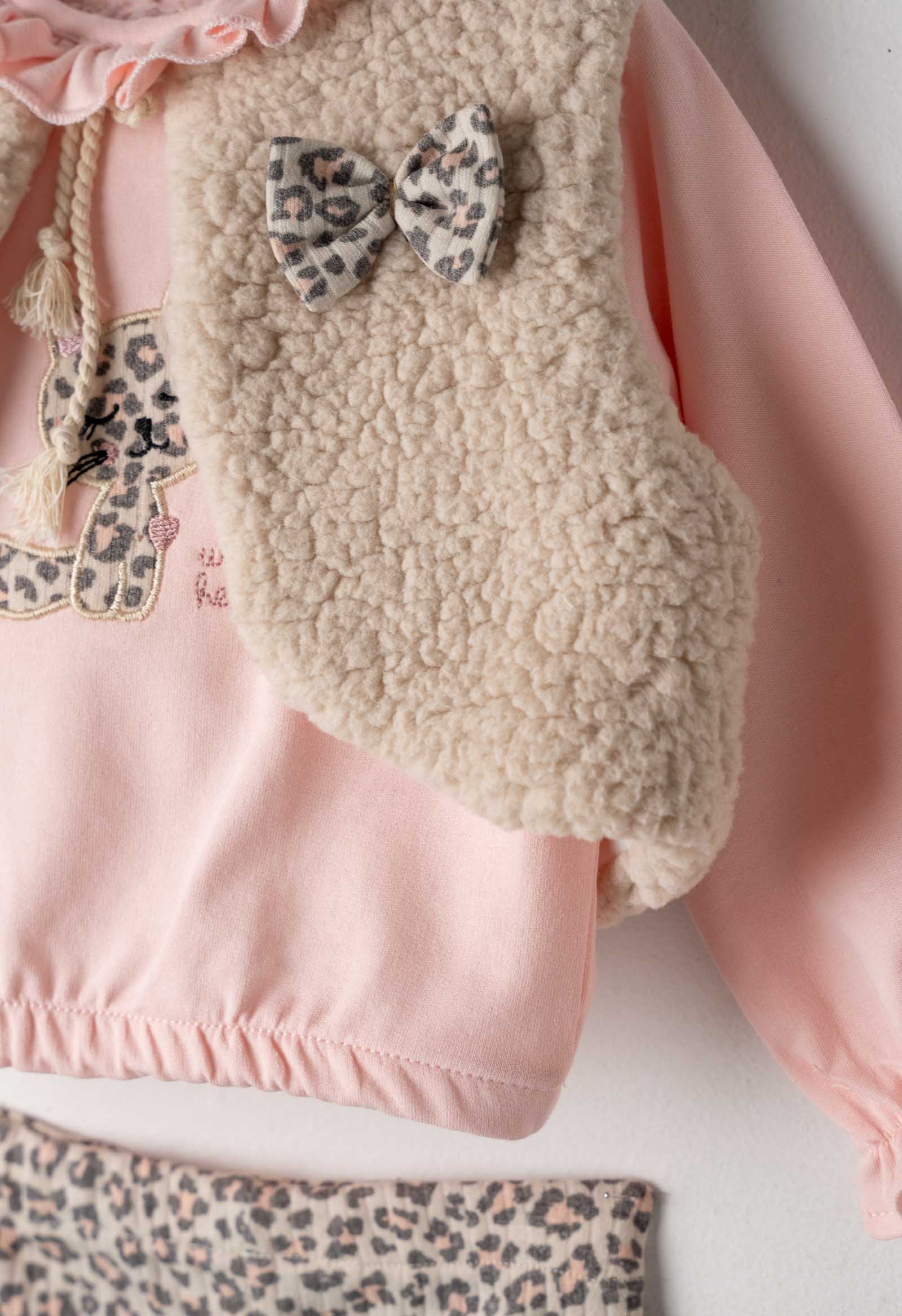 Σετ κολάν με animal print σχέδιο, μπλούζα σε ροζ χρώμα με σχέδιο και αμάνικο γούνινο γιλέκο σε μπεζ χρώμα, για κορίτσι 6-24 μηνών. Στο σετ περιλαμβάνεται και τσαντάκι.