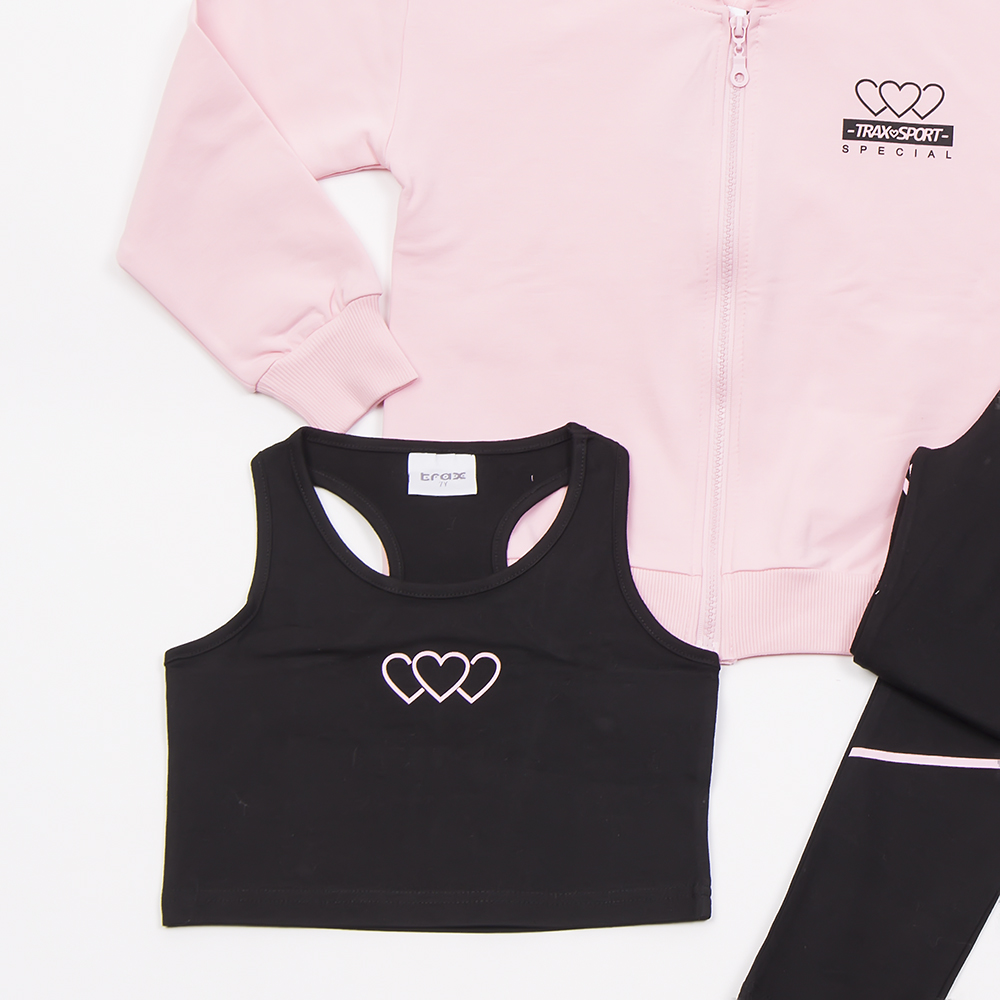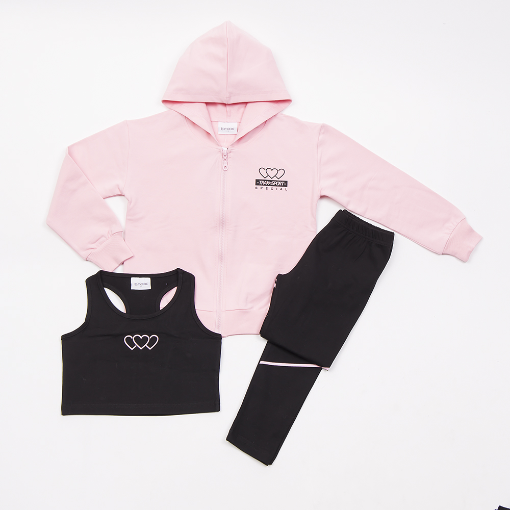 Σετ κολάν 3 τμχ για κορίτσι 6-16 ετών. Το σετ αποτελείται από ζακέτα με κουκούλα σε ροζ χρώμα, κολάν αθλητικό σε μαύρο χρώμα με ροζ λεπτομέρειες και τοπ αθλητικό σε μαύρο χρώμα με τύπωμα.