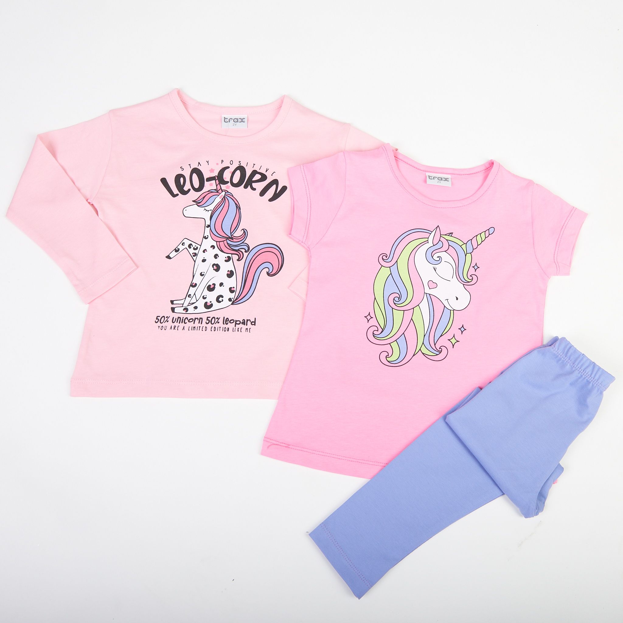 Σετ κολάν 3 τμχ για κορίτσι 1-6 ετών. Το σετ αποτελείται από κολάν σε γαλάζιο χρώμα, μπλούζα με μακρύ μανίκι σε ροζ ανοιχτό χρώμα με τύπωμα και μπλούζα με κοντό μανίκι σε ροζ έντονο χρώμα με τύπωμα.