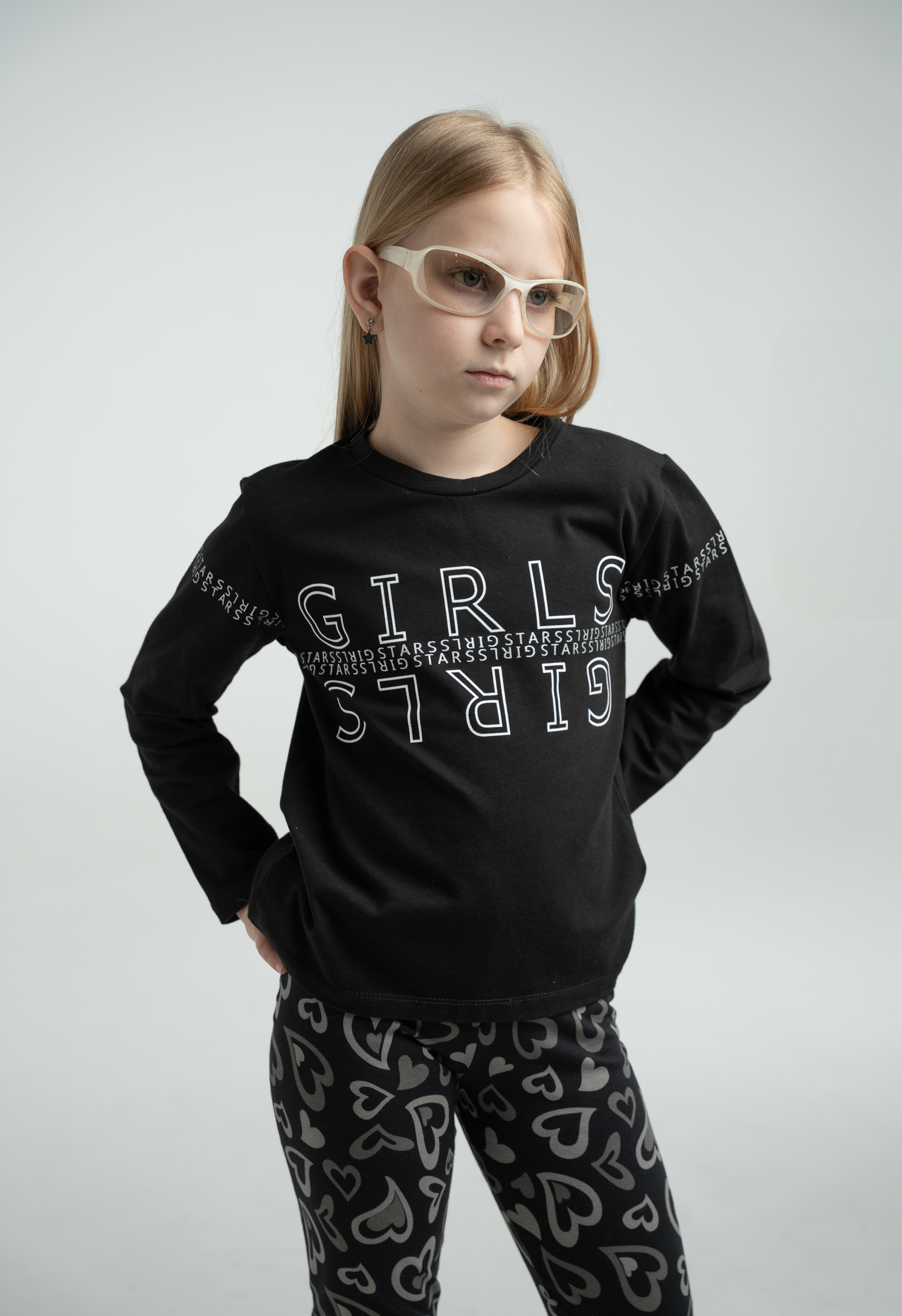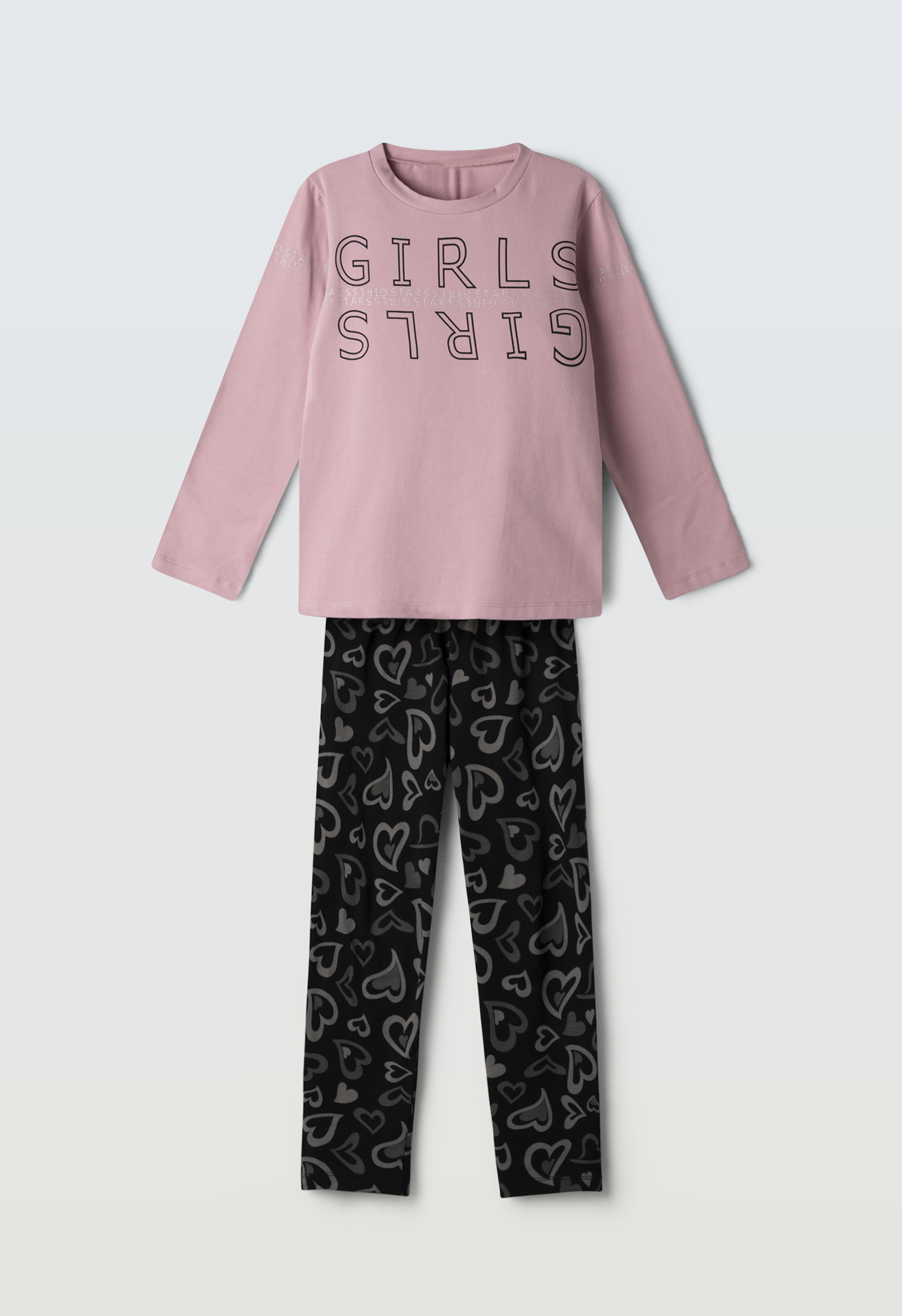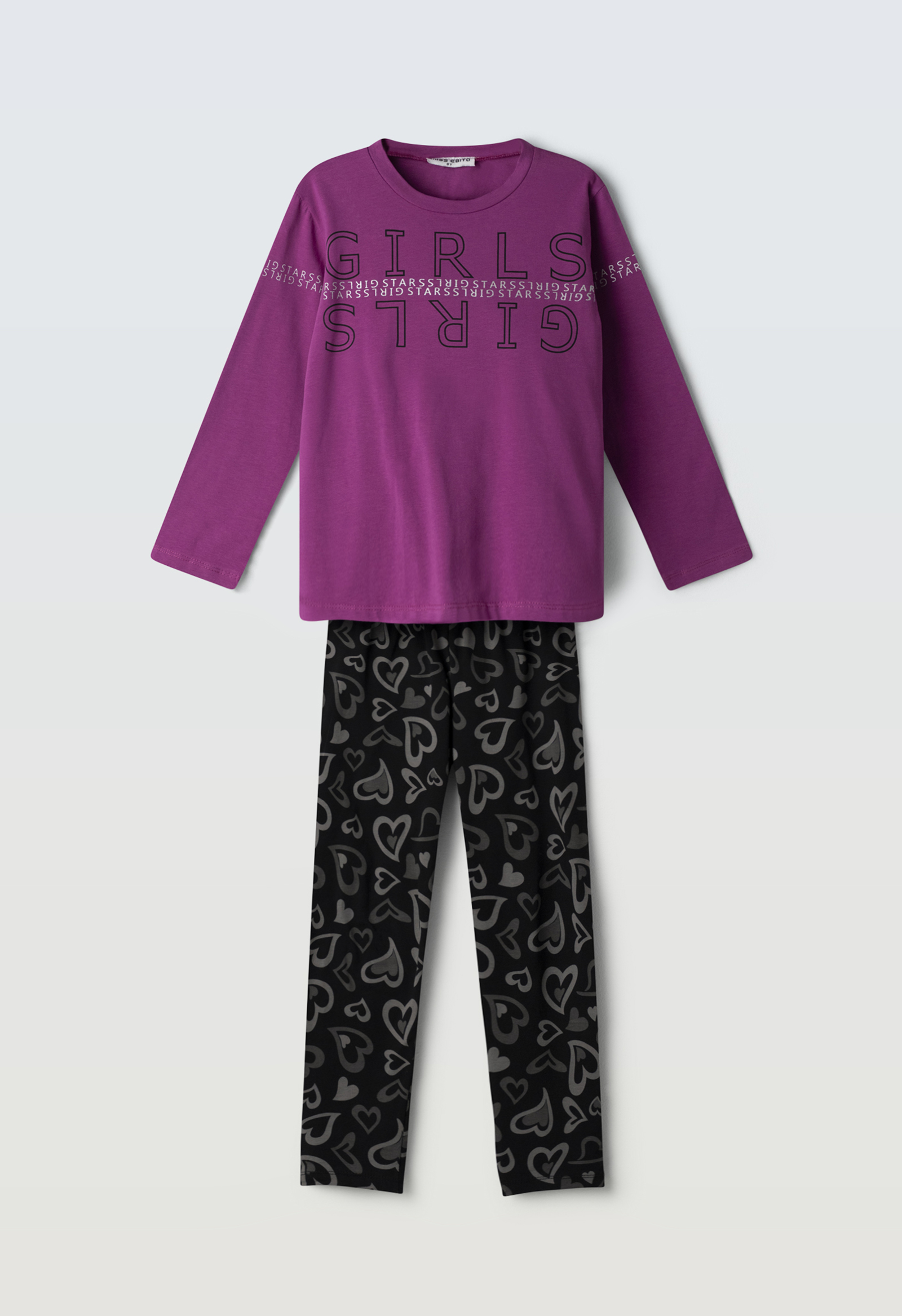 Σετ κολάν για κορίτσι 6-16 ετών. Το σετ αποτελείται από κολάν σε μαύρο χρώμα με allover τύπωμα και μπλούζα σε δύο αποχρώσεις – πούδρα και μωβ- με τύπωμα.