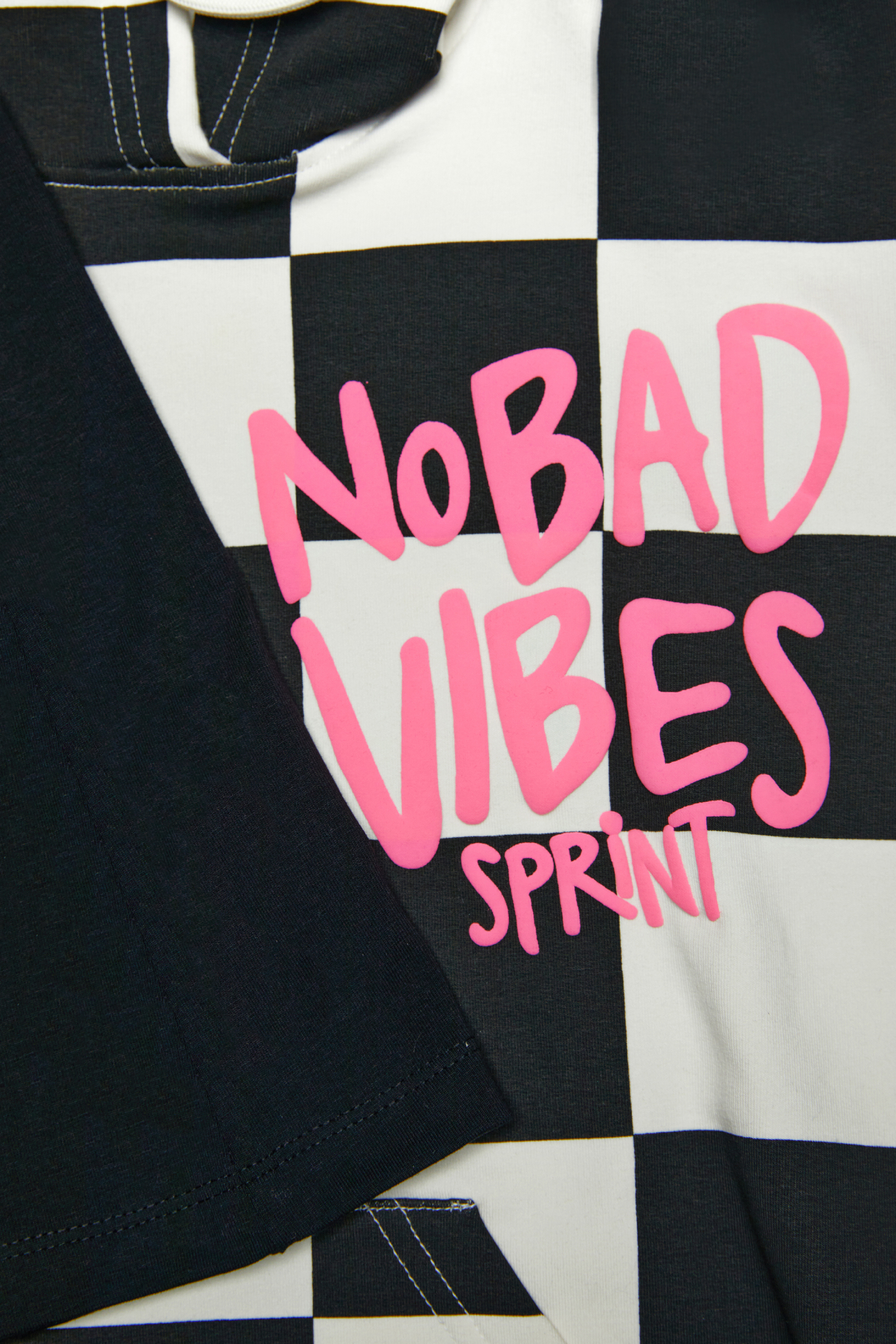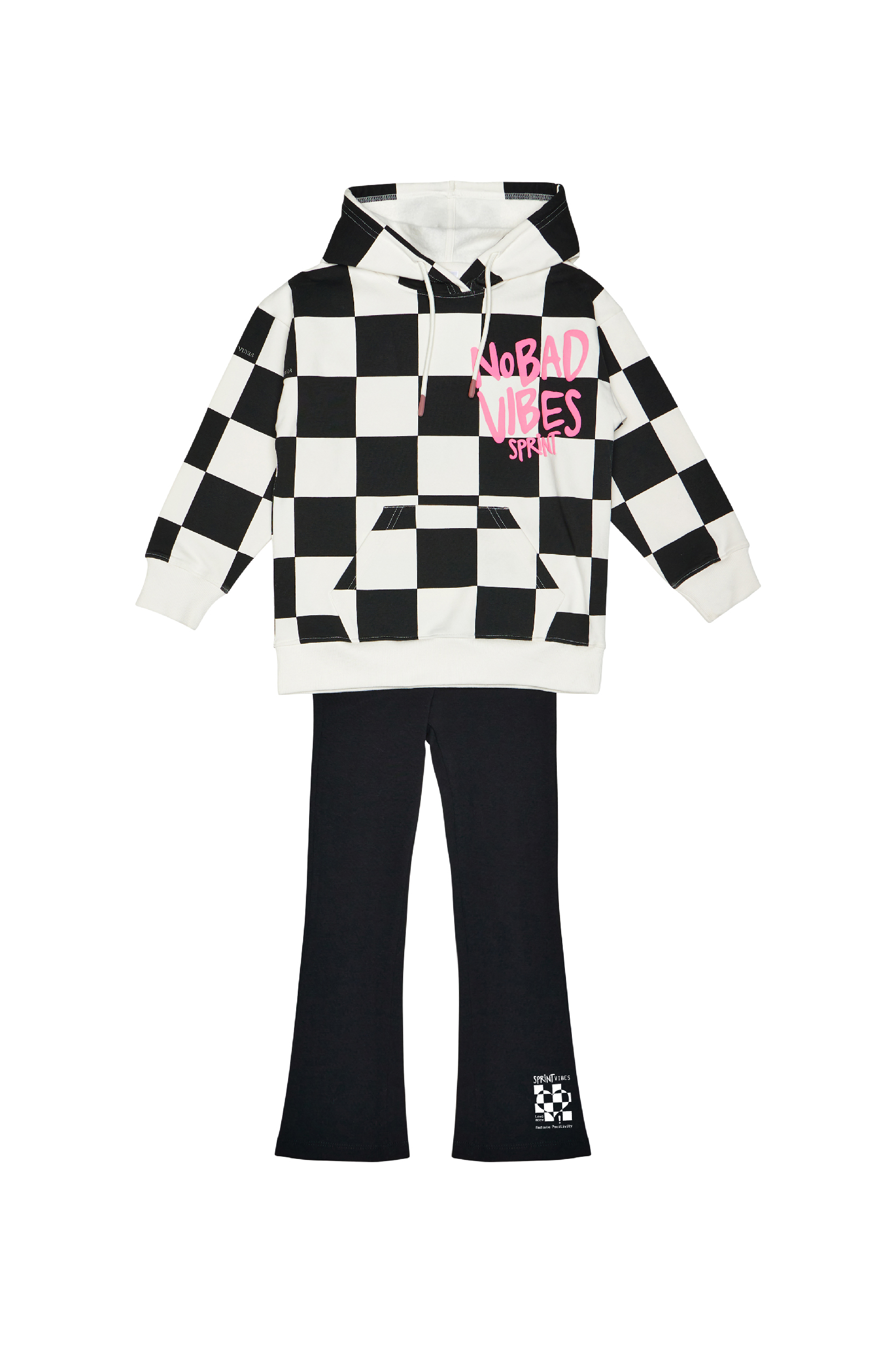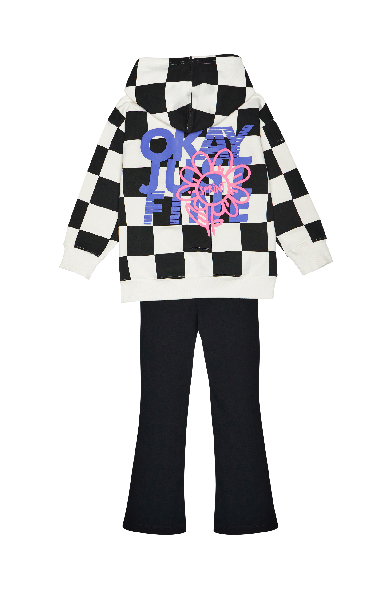 Σετ κολάν καμπάνα για κορίτσι 6-16 ετών. Το σετ αποτελείται από μπλούζα φούτερ με κουκούλα με allover τύπωμα σε άσπρο- μαύρο χρώμα με ιδιαίτερο τύπωμα στην πλάτη και κολάν με καμπάνα σε μαύρο χρώμα.