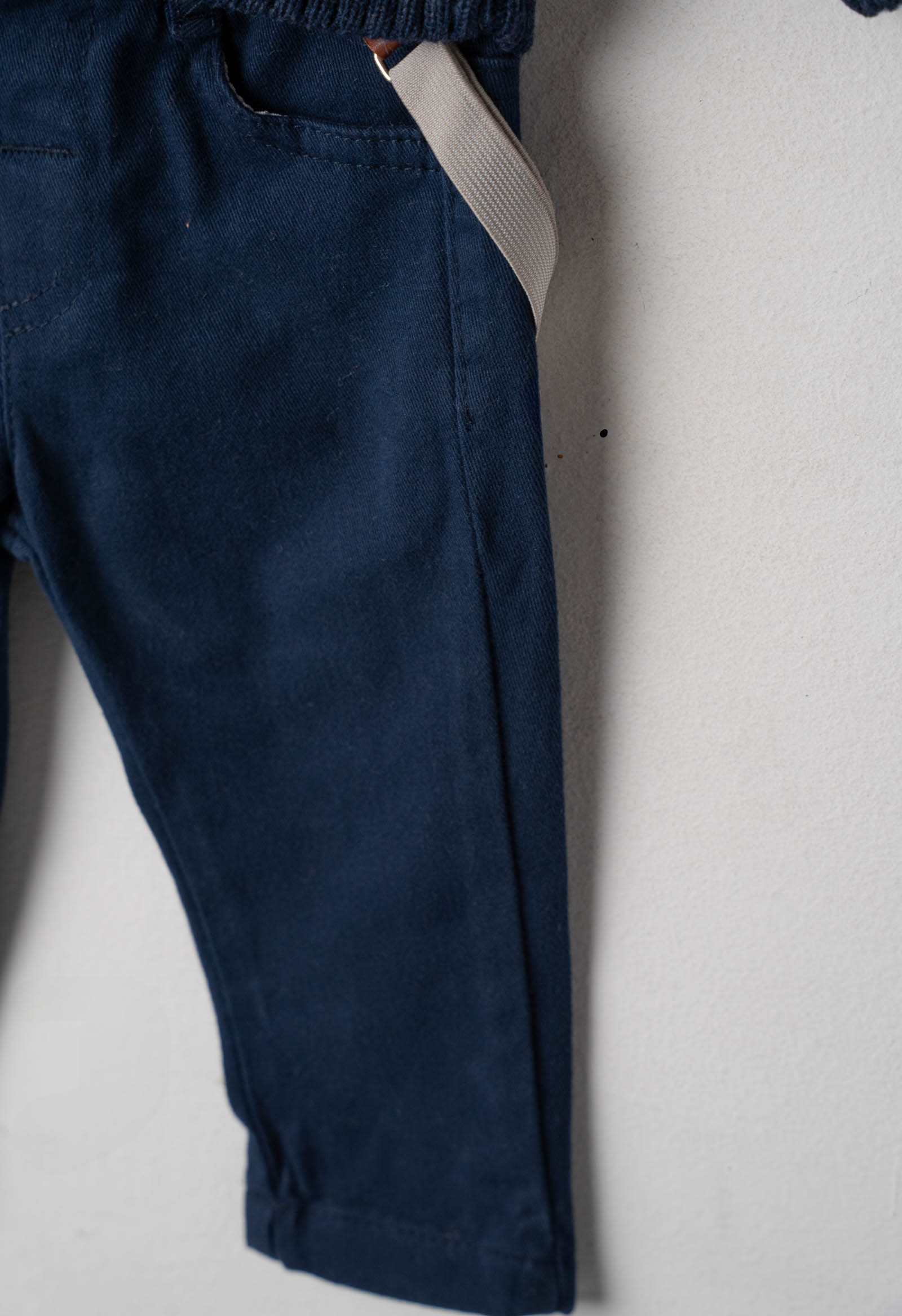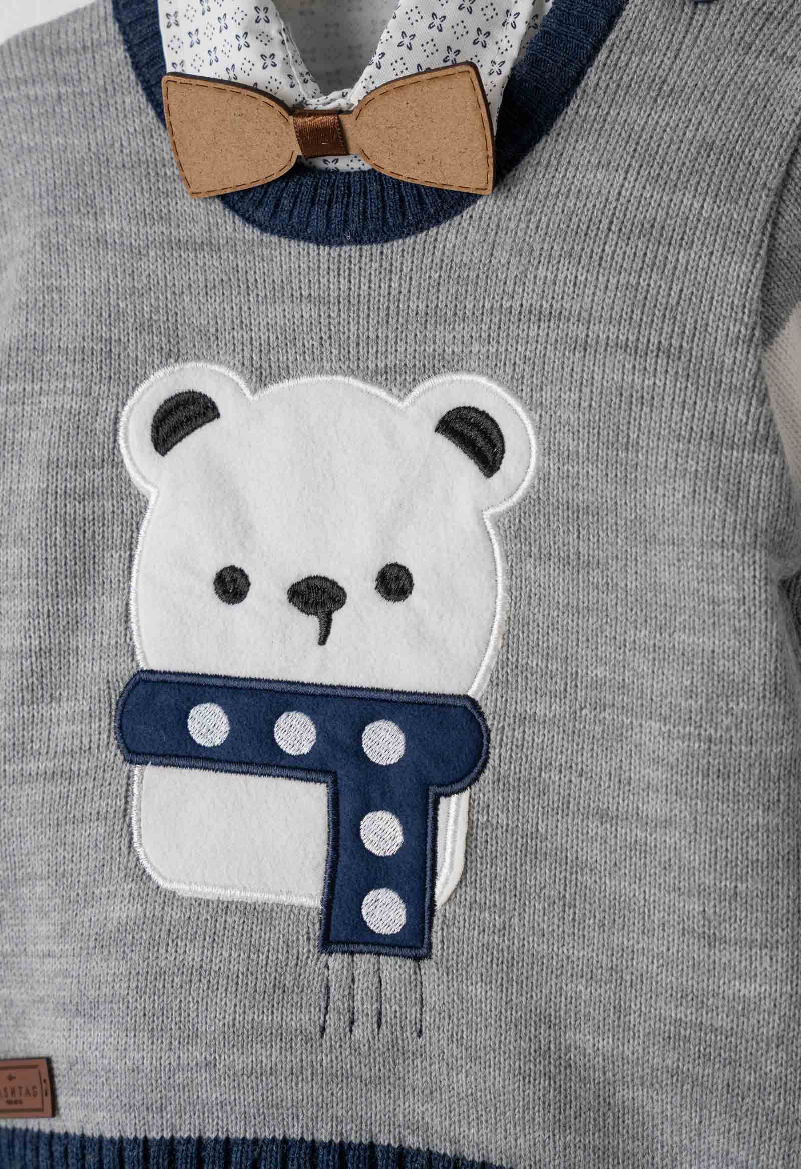 Σετ 3 τμχ για αγόρι 6-24 μηνών. Το σετ αποτελείται από παντελόνι σε μπλε χρώμα, πουκάμισο σε λευκό χρώμα με allover τύπωμα, πλεκτό πουλόβερ σε γκρι χρώμα με ιδιαίτερο σχέδιο και τύπωμα. Επίσης το σετ αποτελείται από τιράντες και ξύλινο παπιγιόν.