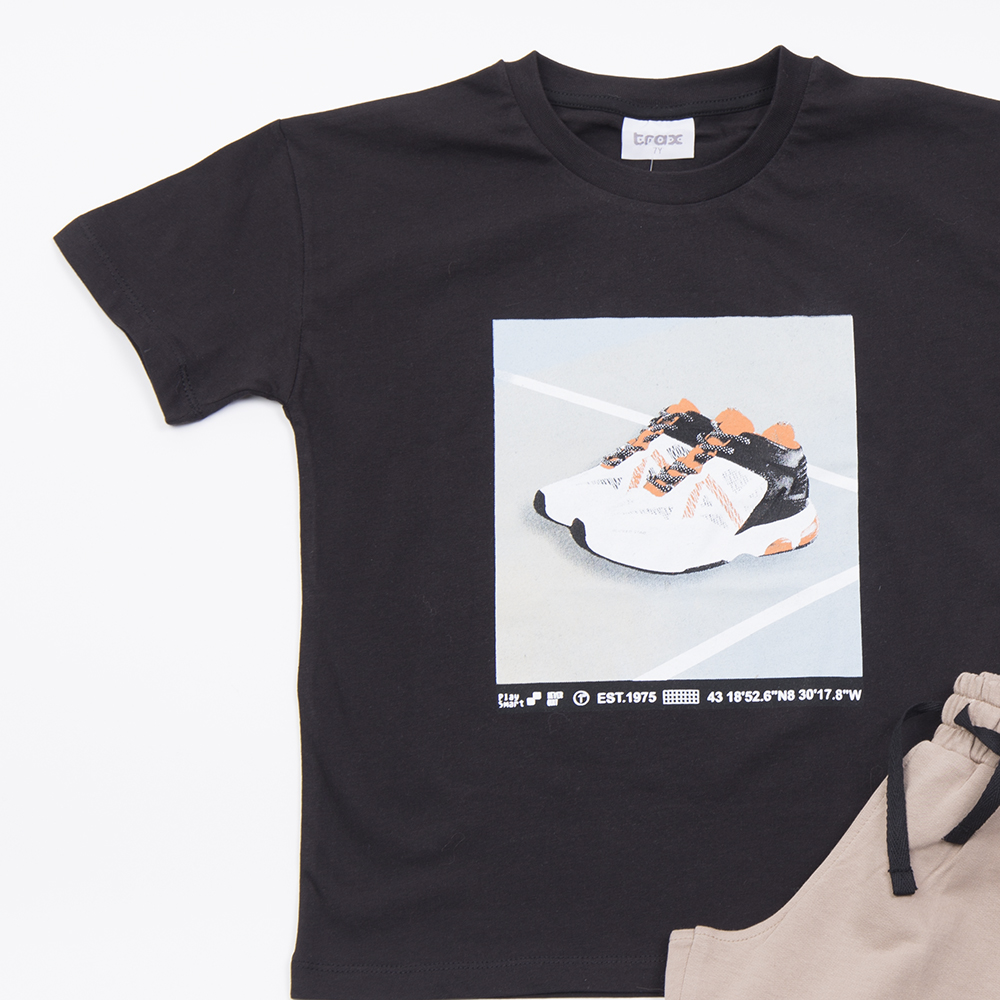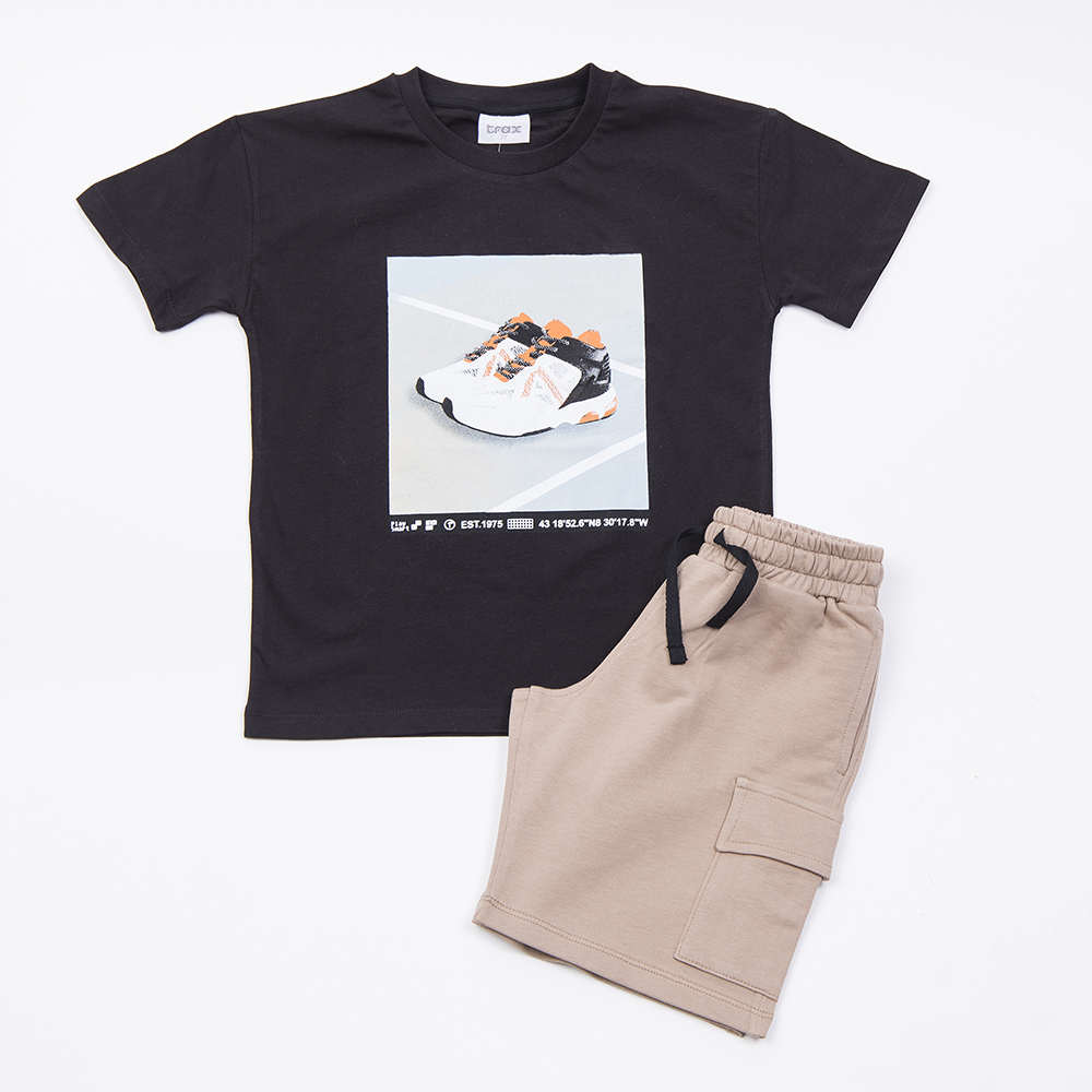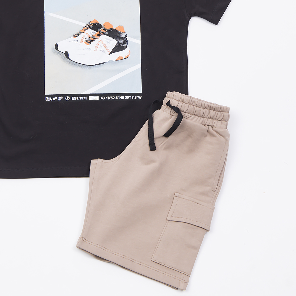 Σετ βερμούδα cargo σε μπεζ χρώμα και μπλούζα σε μαύρο χρώμα με τύπωμα, για αγόρι 6-16 ετών.