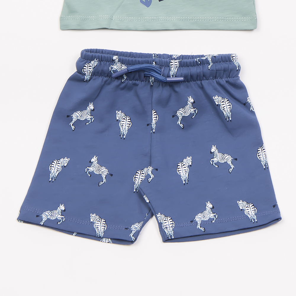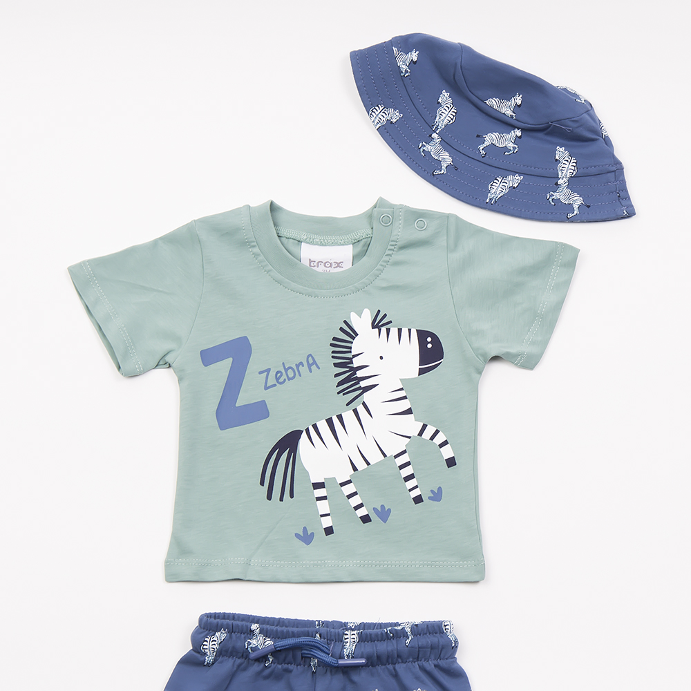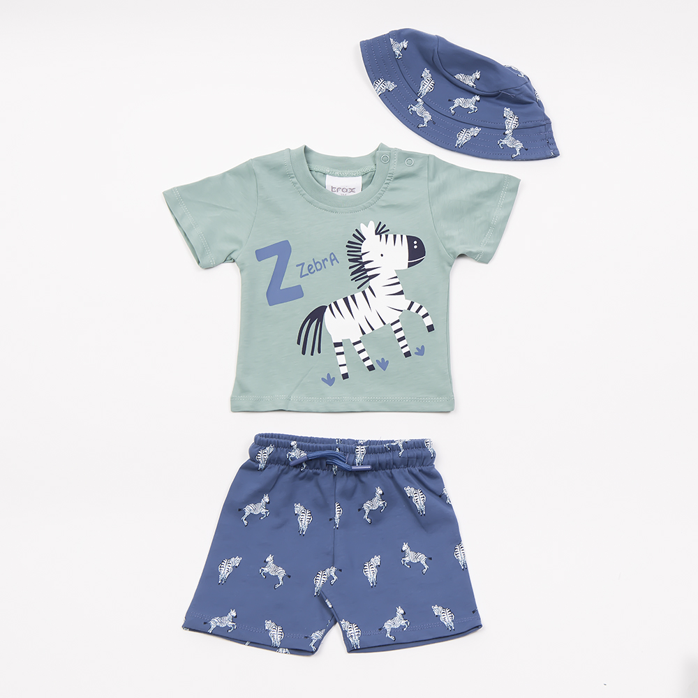 Σετ βερμούδα σε μπλε χρώμα με allover τύπωμα και ίδιο χρώμα καπέλο και μπλούζα με τύπωμα στο χρώμα της μέντας, για αγόρι 3-24 μηνών