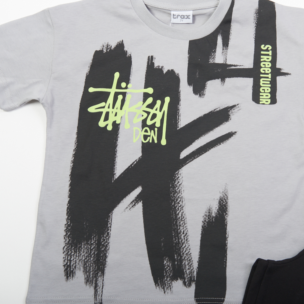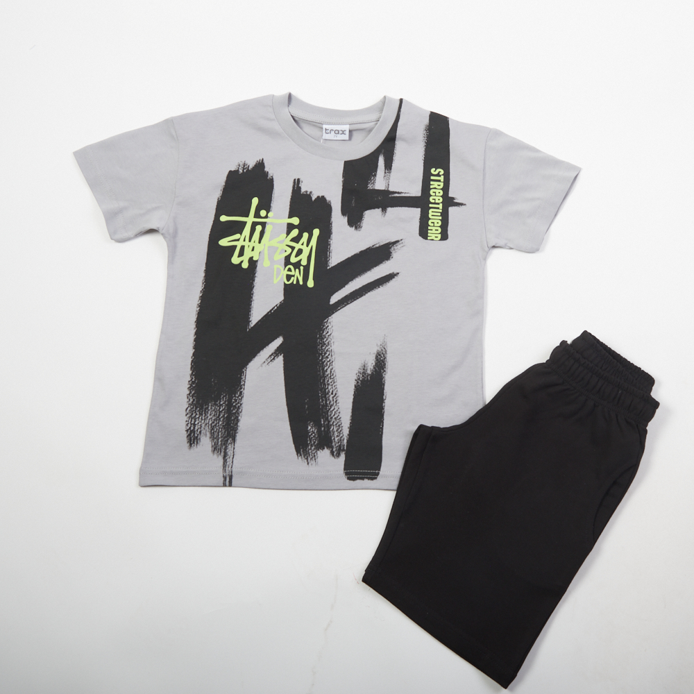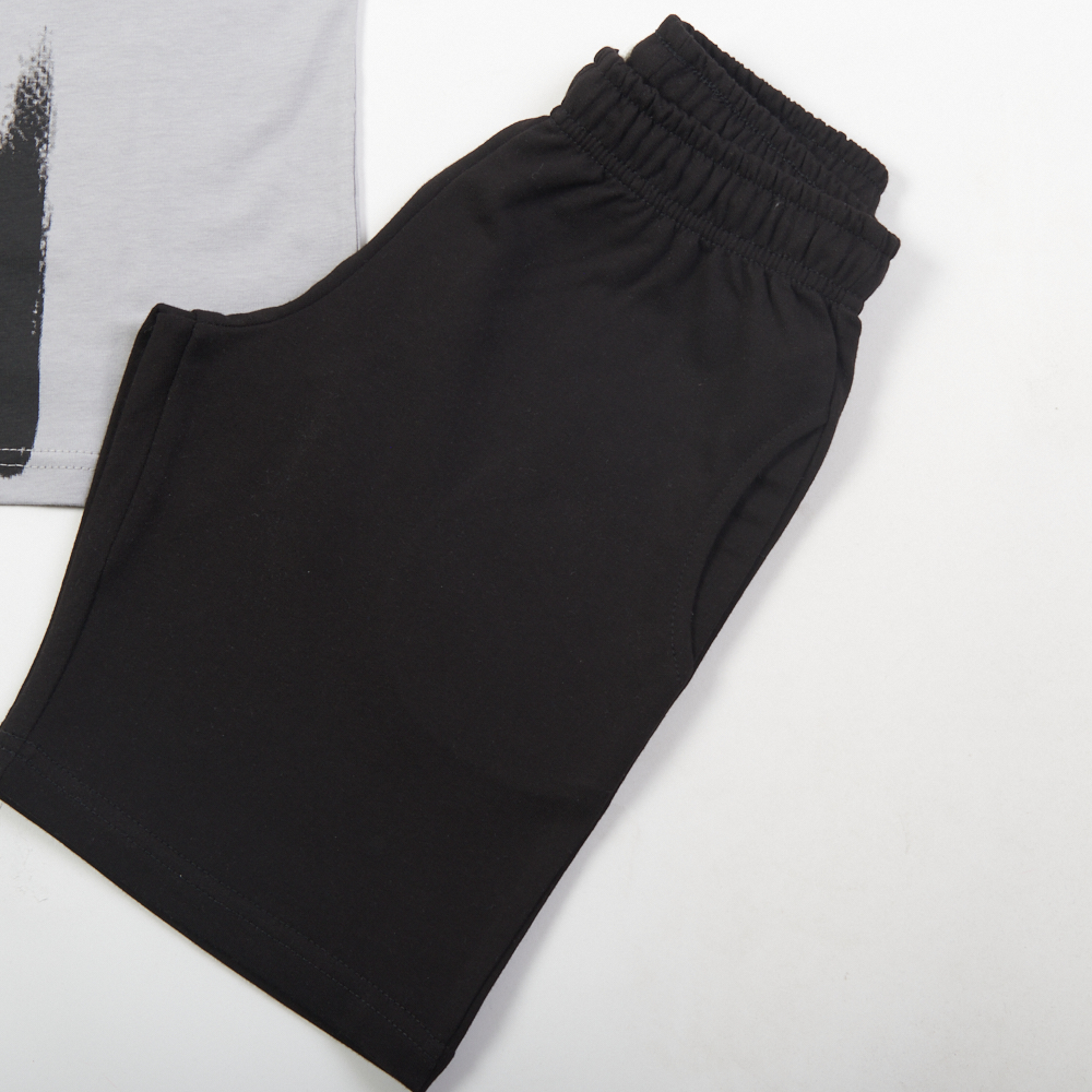 Σετ βερμούδα μακό σε μαύρο χρώμα και μπλούζα σε γκρι χρώμα με τύπωμα, για αγόρι 6-16 ετών.