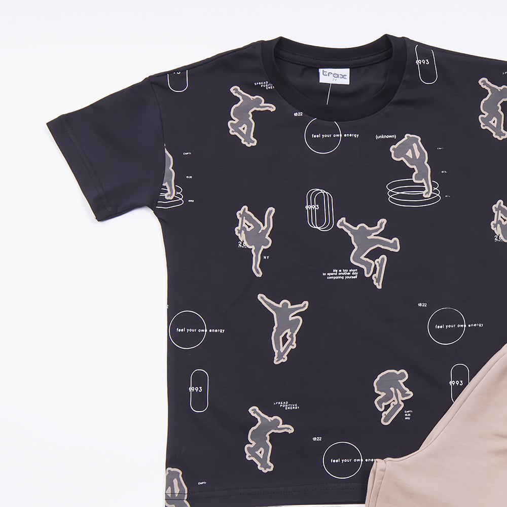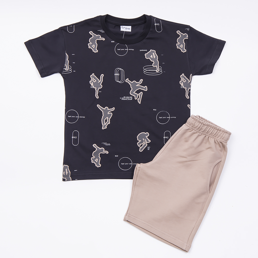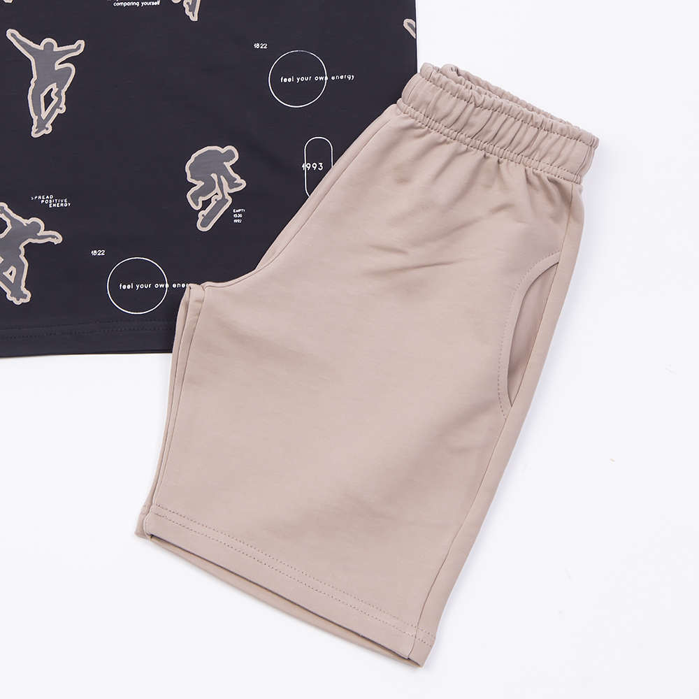 Σετ βερμούδα σε μπεζ χρώμα, με λάστιχο στην μέση, μπλούζα σε μαύρο χρώμα με allover τύπωμα, για αγόρι 6-16 ετών