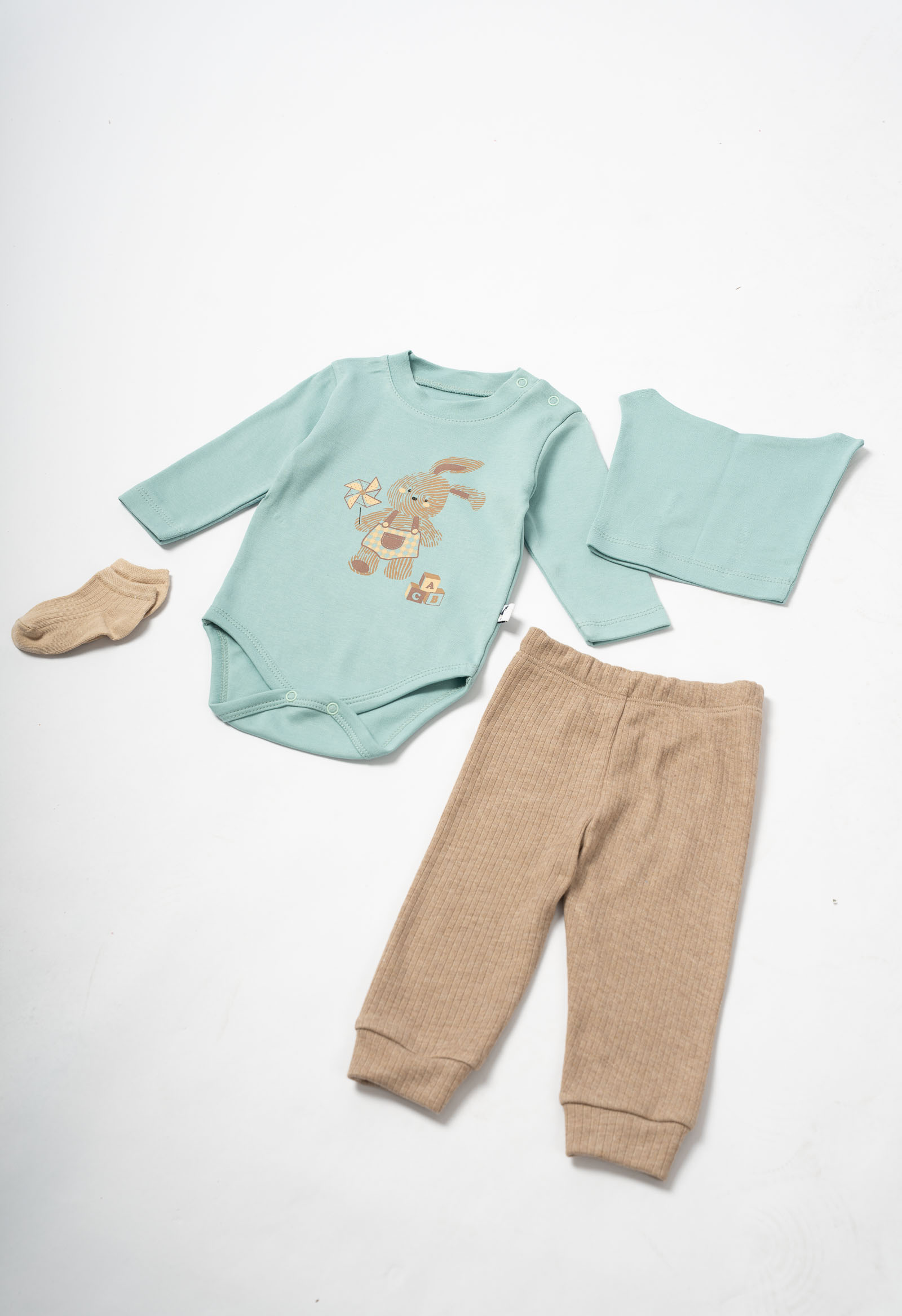 Βρεφικό σετ για αγόρι 0-12 μηνών. Το σετ αποτελείται από παντελόνι σε καφέ χρώμα, ολόσωμο φορμάκι στο χρώμα της μέντας με σχέδιο , καλτσάκια και σκουφάκι στο χρώμα της μέντας